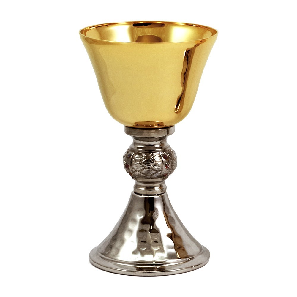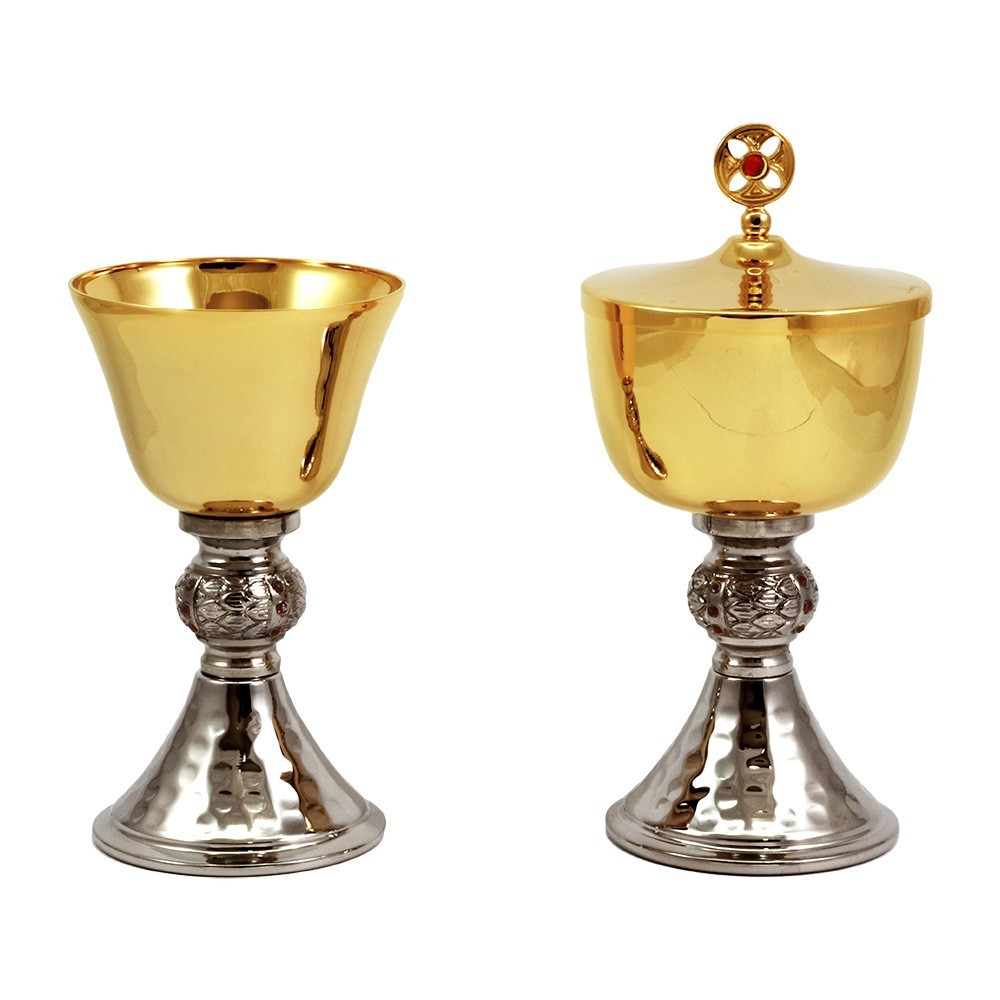 Set liturgico composto da calice e pisside in ottone bicolore con pietre rosse.