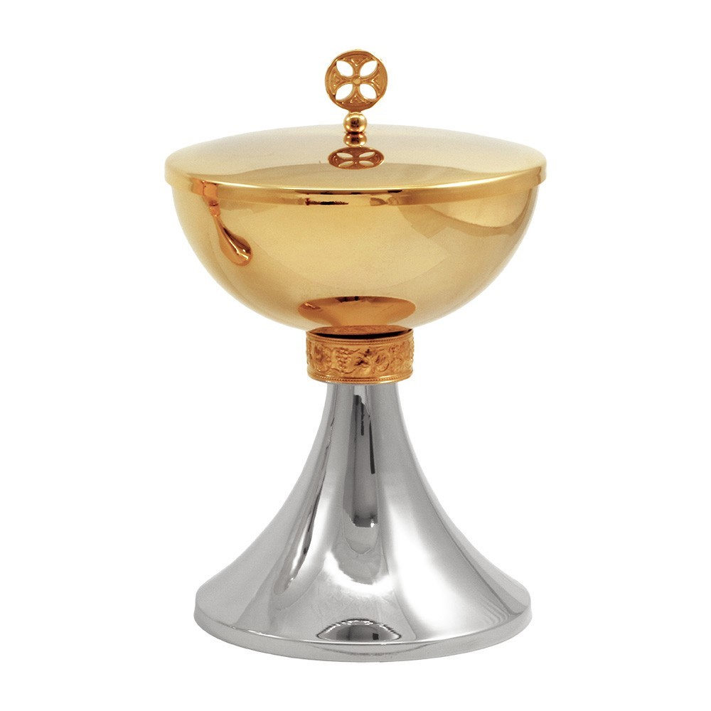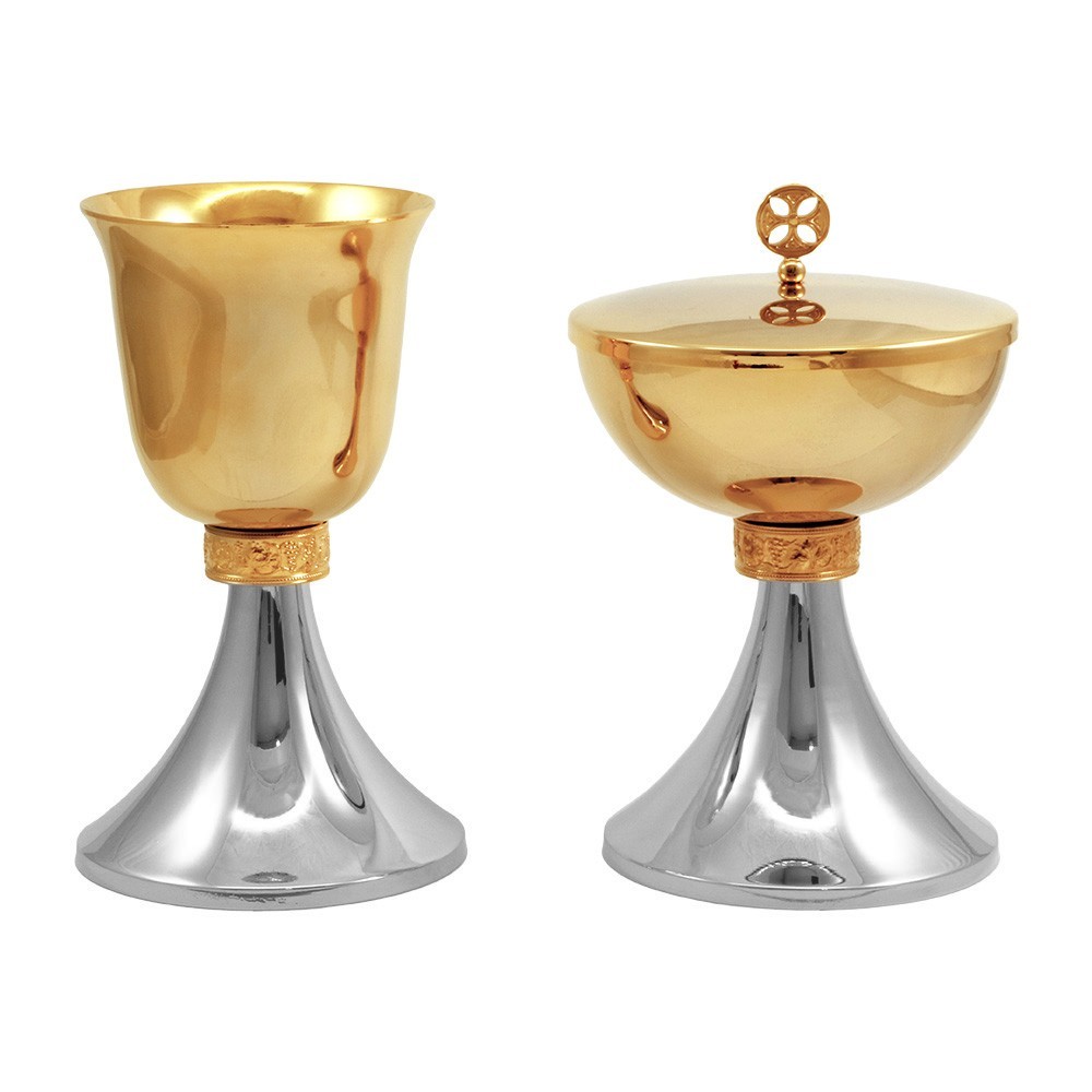 Coppia calice e pisside prodotta in ottone dorato e argentato, con doratura garantita 24k. Molto particolare è il nodo in fusione decorato con "Uve e Foglie di Vite".