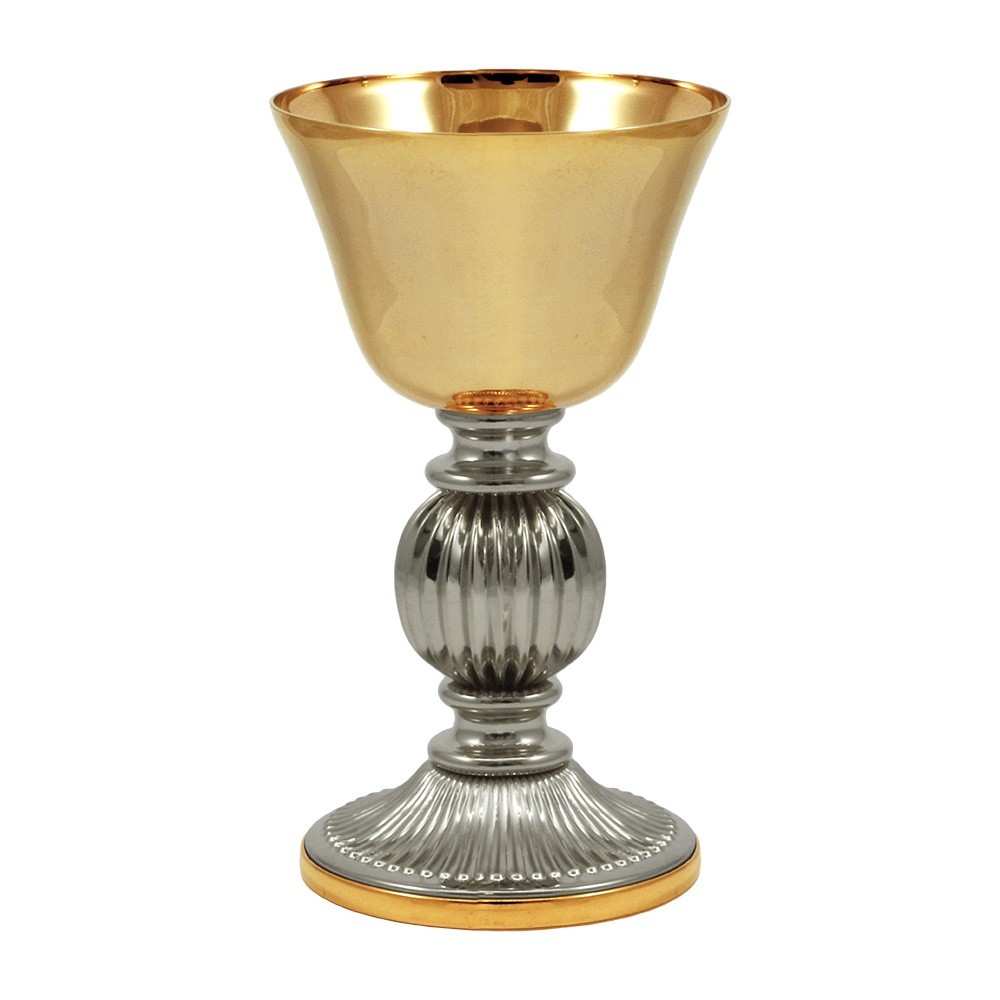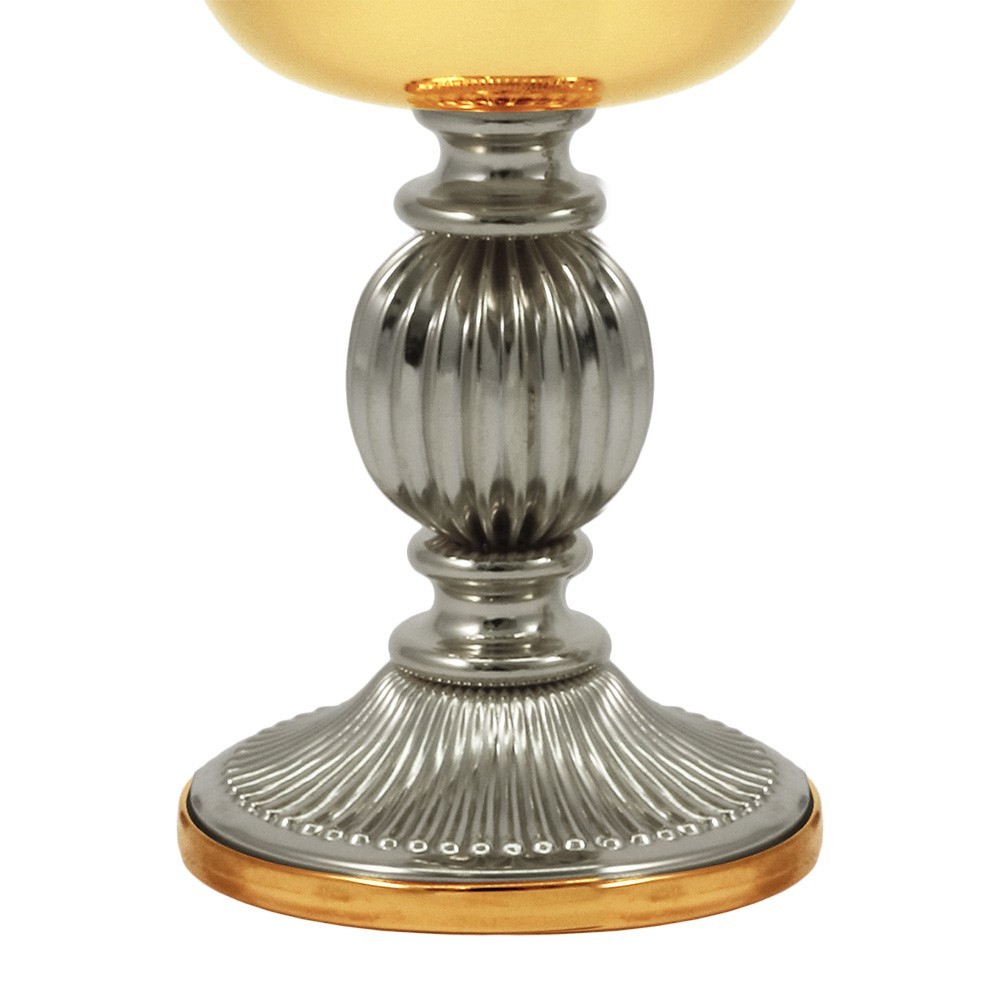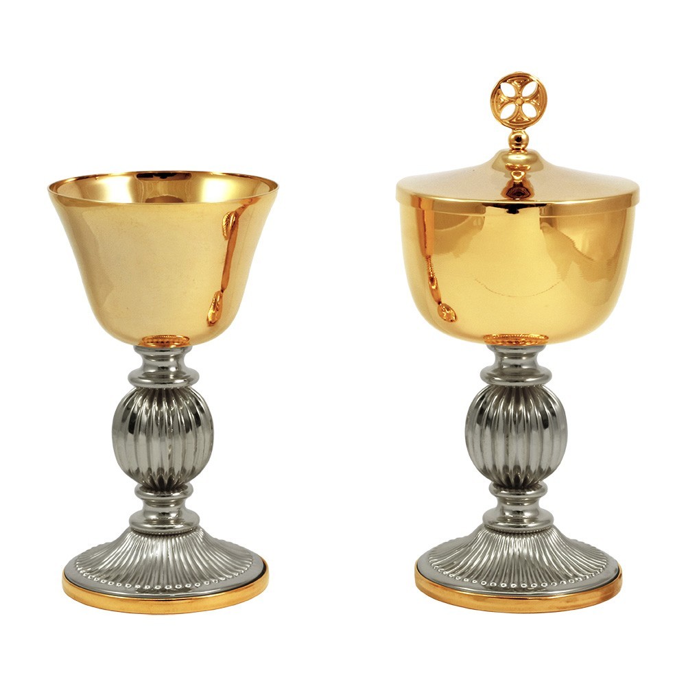Set liturgico formato da mini calice e mini pisside in ottone bicolore oro e argento, con base e nodo rigato.