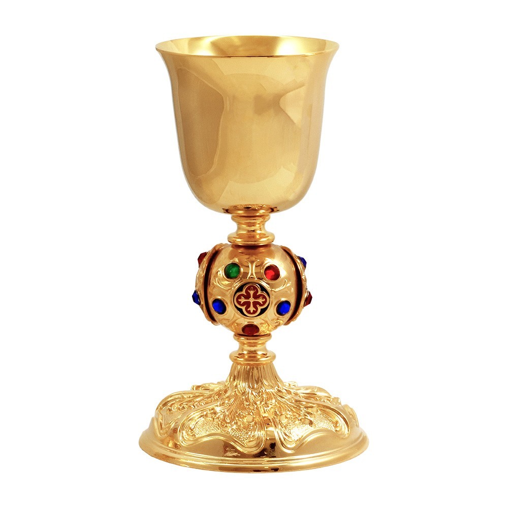 Calice in ottone dorato 24 carati, con nodo barocco con pietre e croce smaltata.