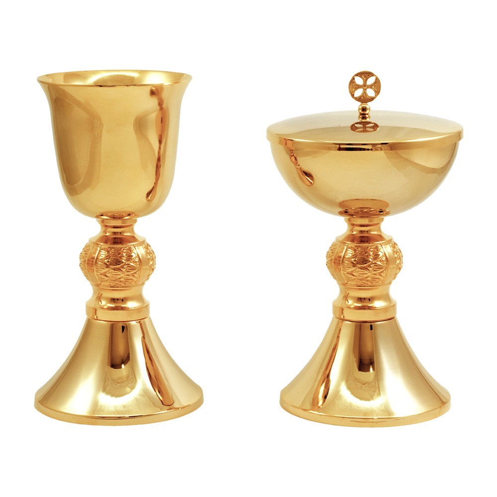 Coppia calice e pisside in ottone dorato 24k. Il nodo presenta eleganti decori effettuati mediante la lavarozione in fusione.