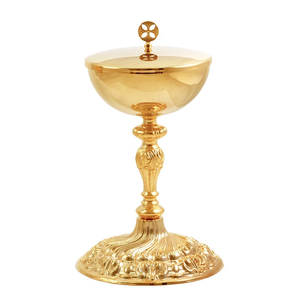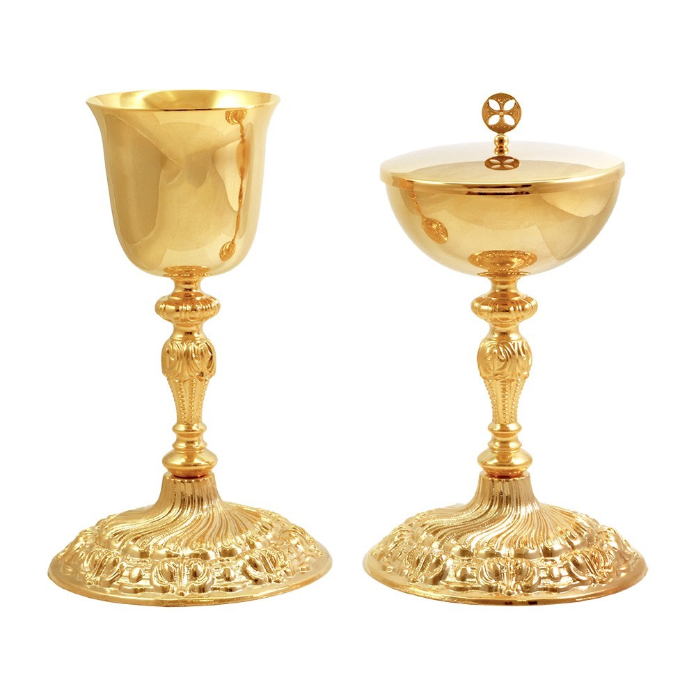 Coppia calice e pisside da messa in ottone dorato con doratura garantita 24k. La base è realizzata mediante una particolare tecnica in fusione e il nodo è in stile Barocco.