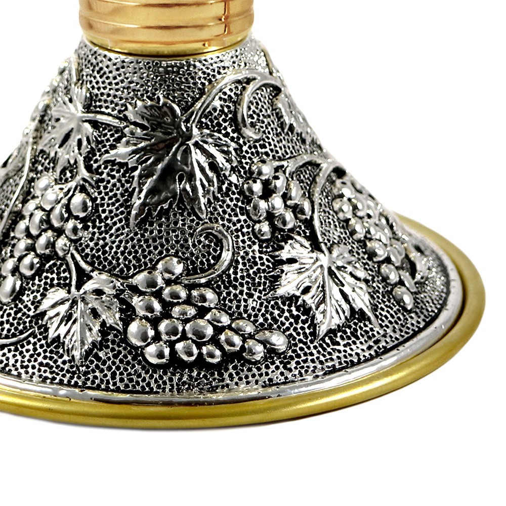 Calice sacerdotale in ottone dorato 24 carati con particolare base e sottocoppa in fusione con decoro "Uva e Foglie di Vite". Il decoro è in rilevo ed è realizzato con finitura argento anticato.