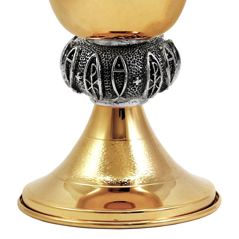 Questo calice liturgico è rigorosamente in ottone dorato 24 carati con particolare nodo decorato "Pesci e PX" in finitura argento anticato, con vernice protettiva.