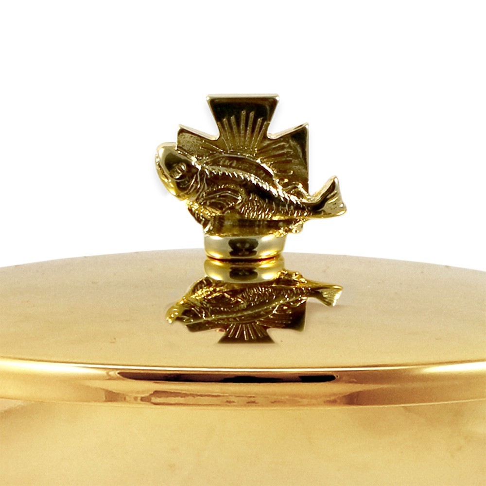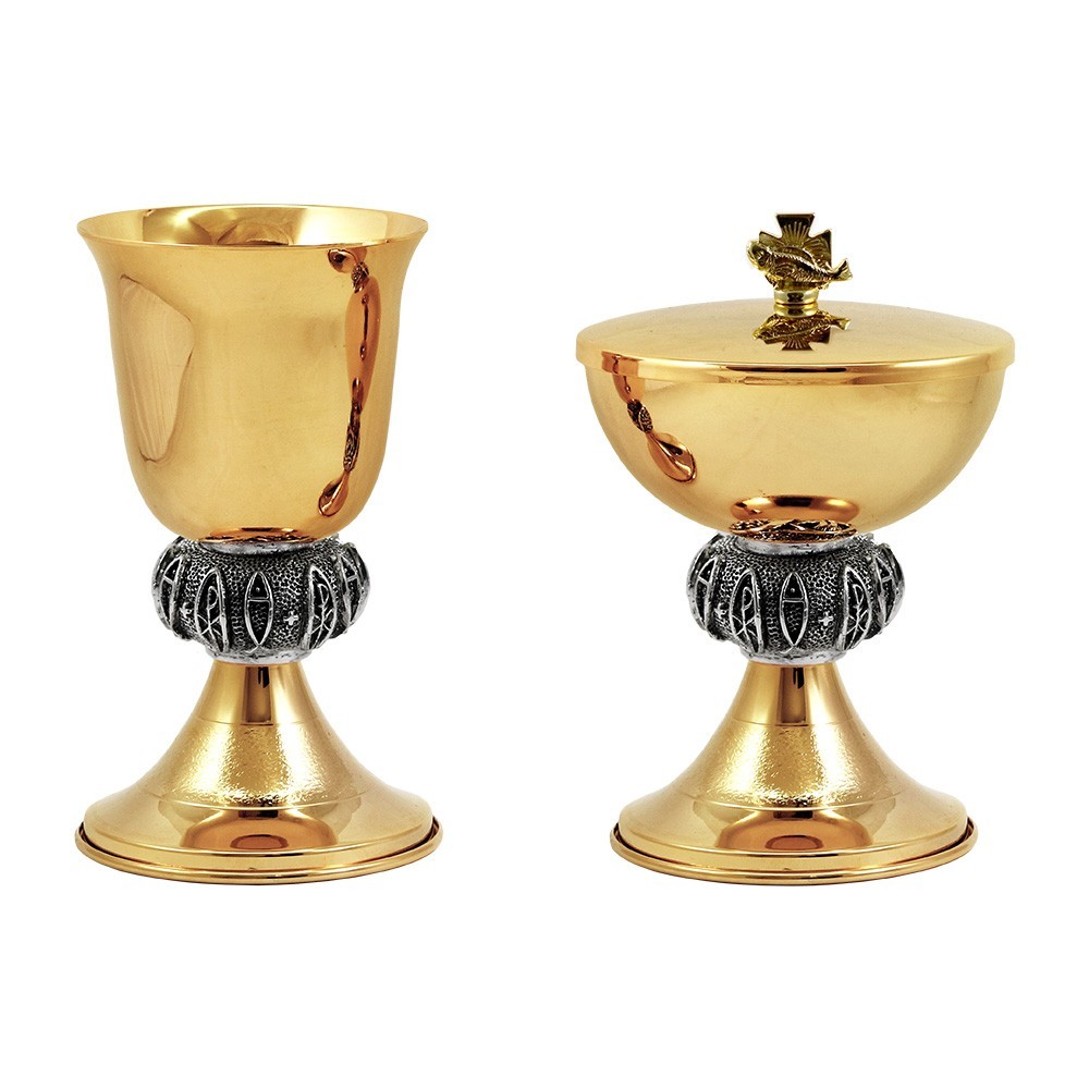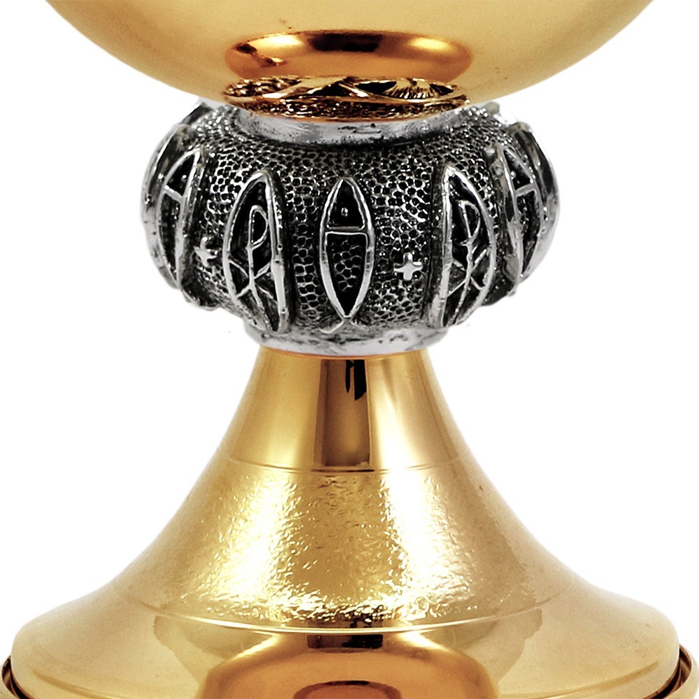 Calice e pisside liturgica in ottone dorato con nodo in argento anticato.