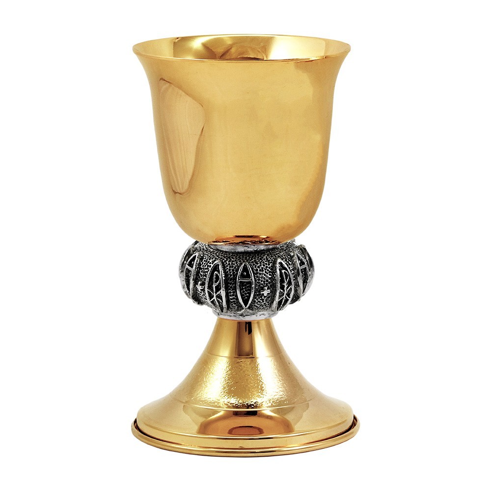Calice liturgico in ottone bicolore, h 24 cm.