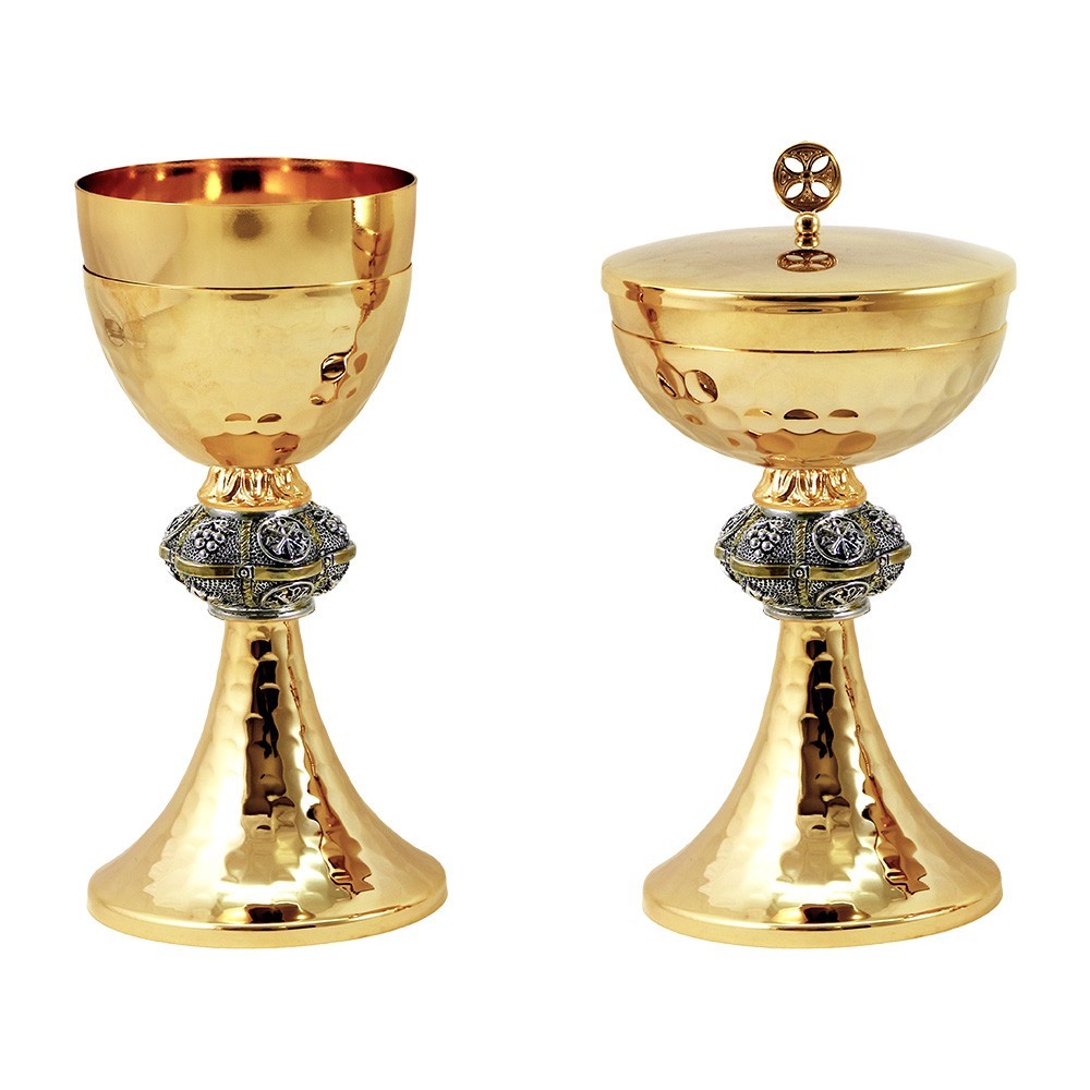 Set completo di calice e pisside in ottone martellato.
