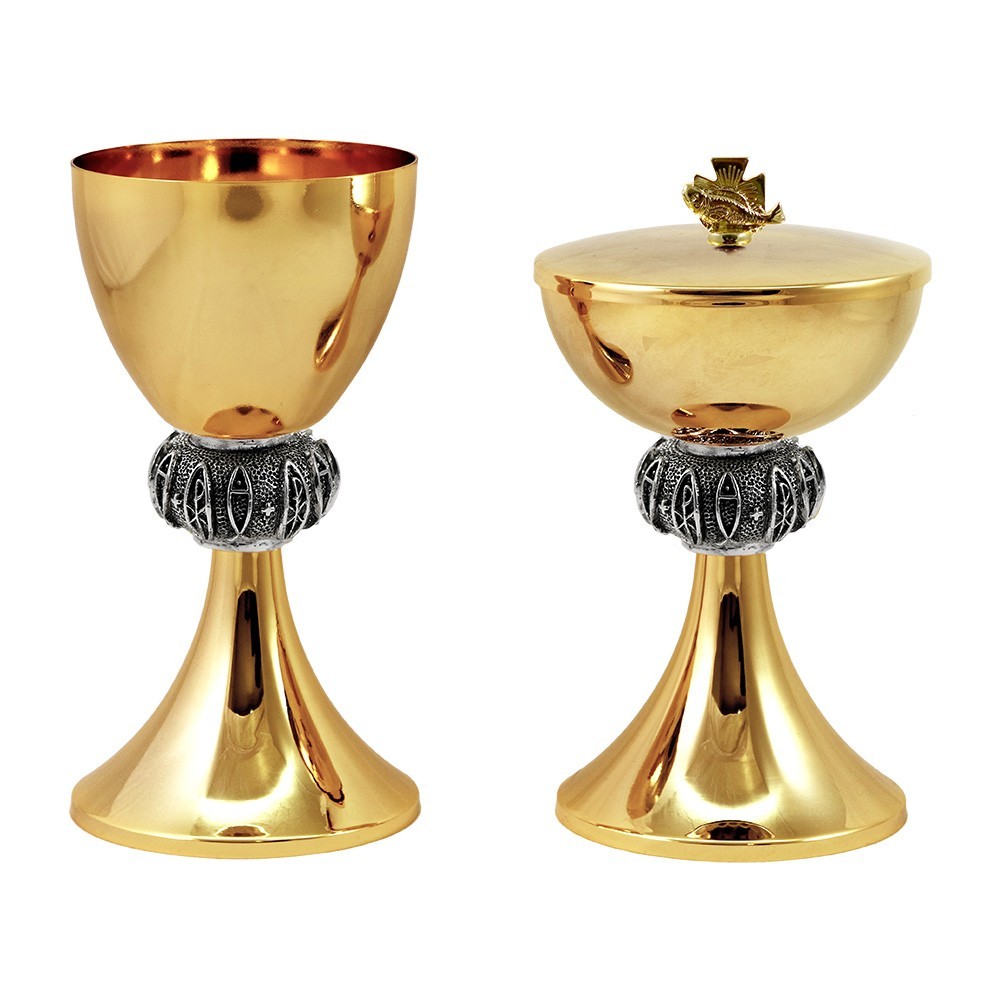 Consegna in 2 settimaneCalice e pisside liturgica in ottone dorato con nodo in argento anticato.