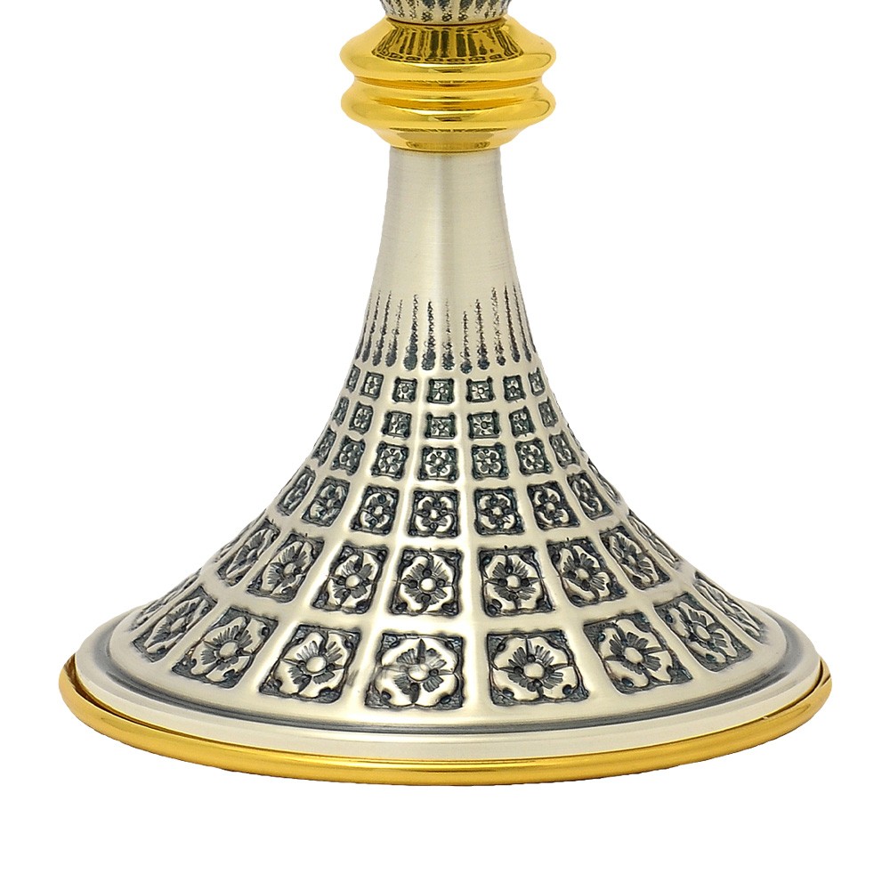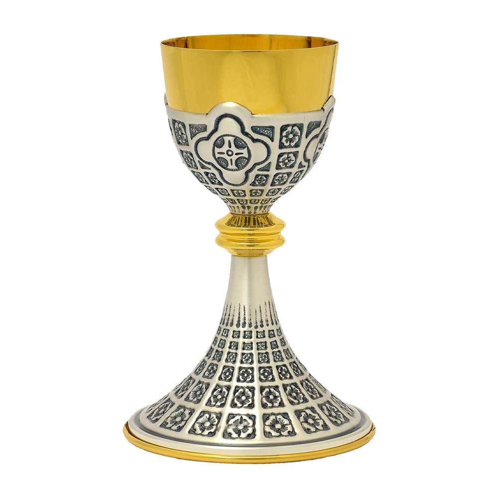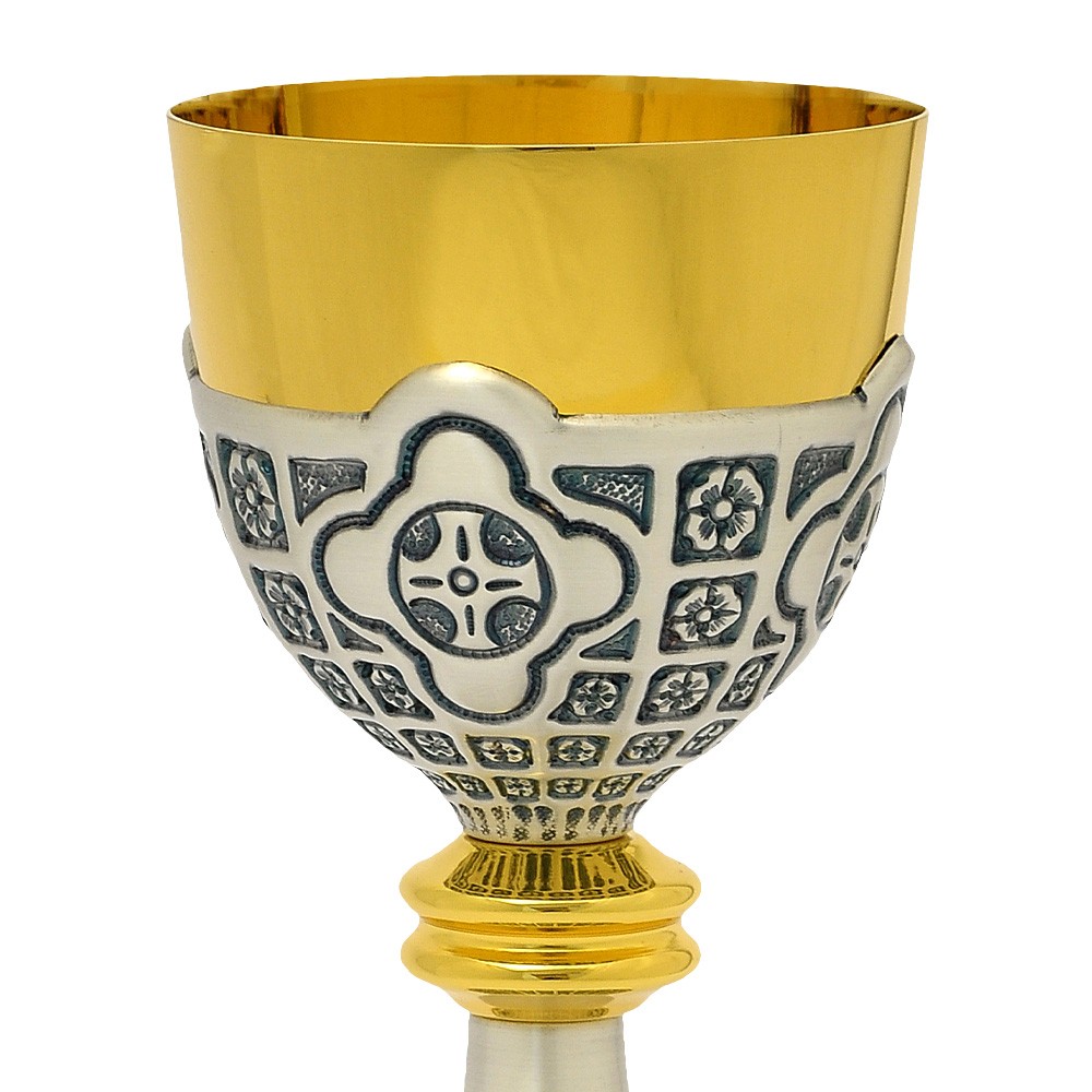 Calice liturgico modello "Pantheon", finemente cesellato con finitura in argento satinato e coppa dorata.