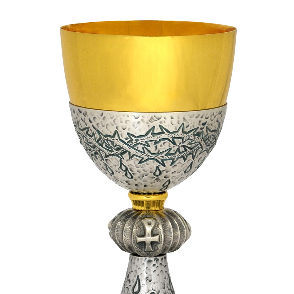 Calice messa in metallo argentato finemente cesellato con coppa dorata.