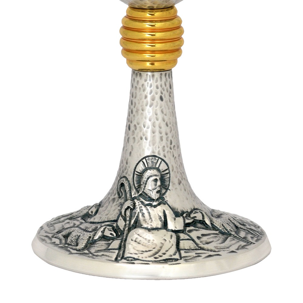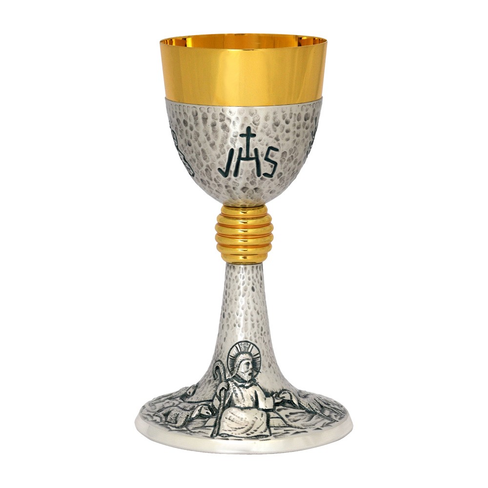 Calice liturgico cesellato finemente a mano, Gesù Buon Pastore e simbolo JHS.
