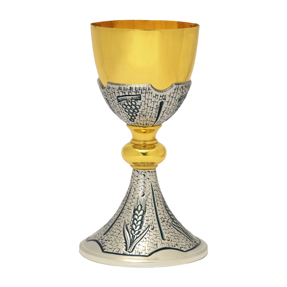 Calice da messa cesellato finemente a mano, la coppa è in metallo dorato, mentre la base è argentata con spighe di grano decorate.