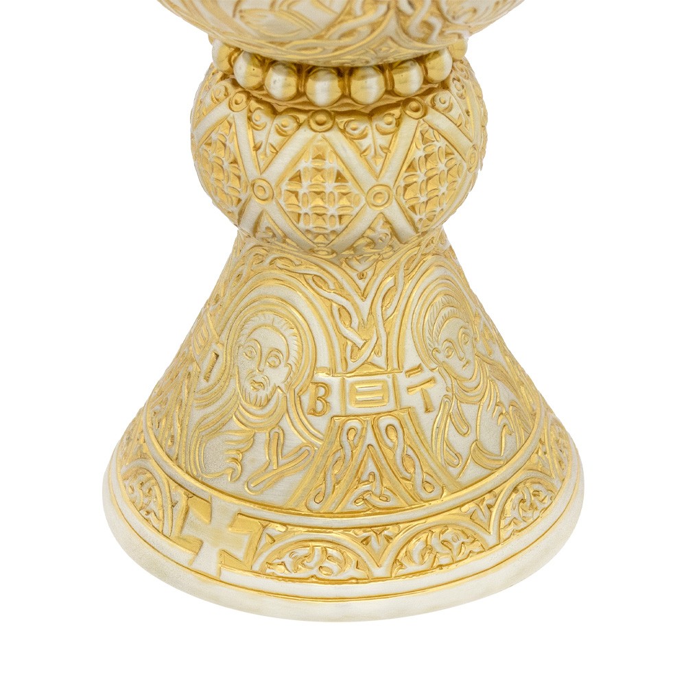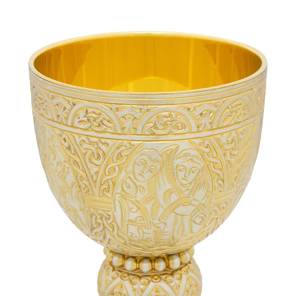 La base del calice è circolare finemente cesellata a mano, raffigurante i quattro Evangelisti, impreziosita con decori ornamentali e una collana di grani tondi e dorati.