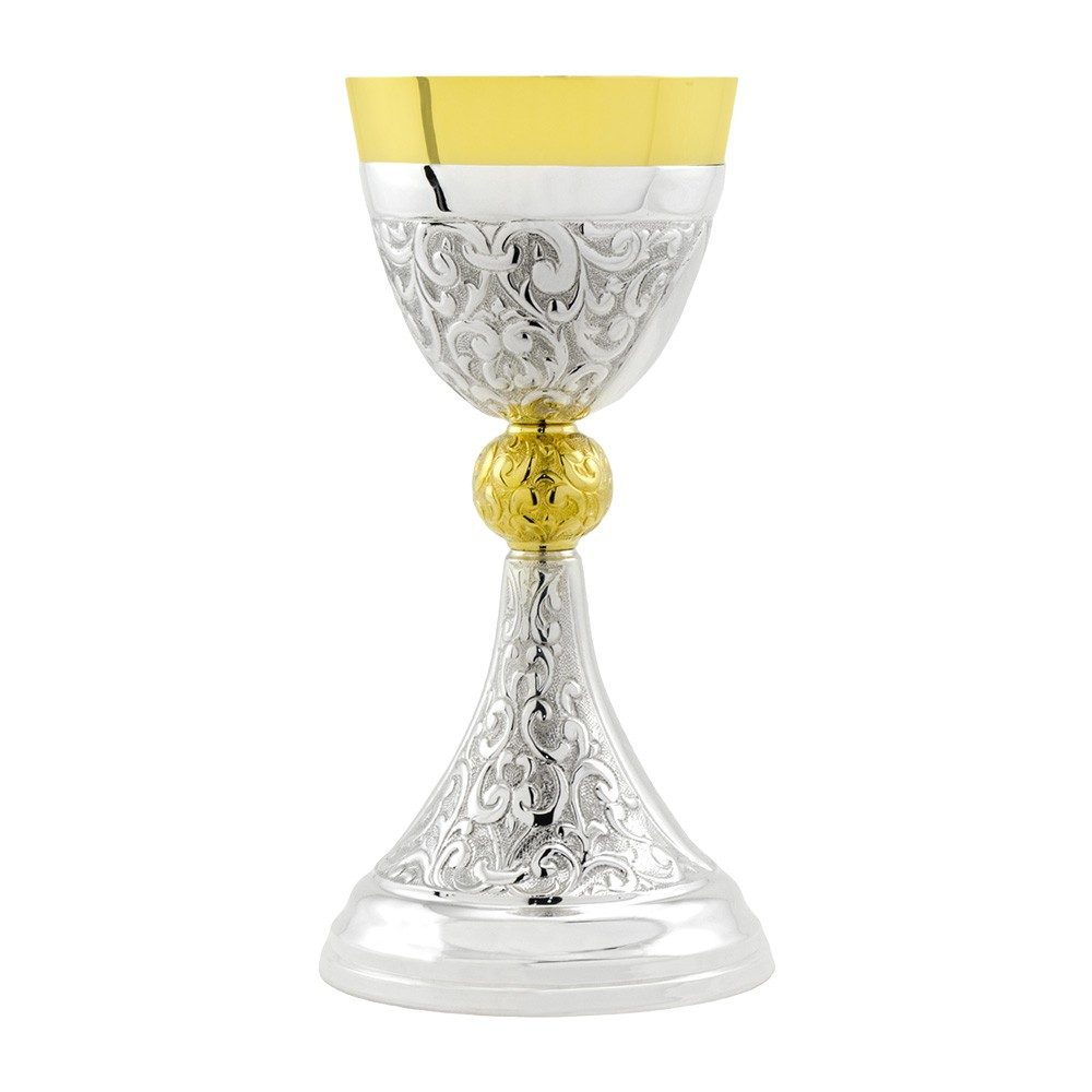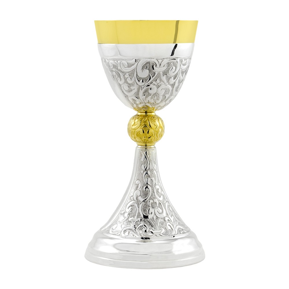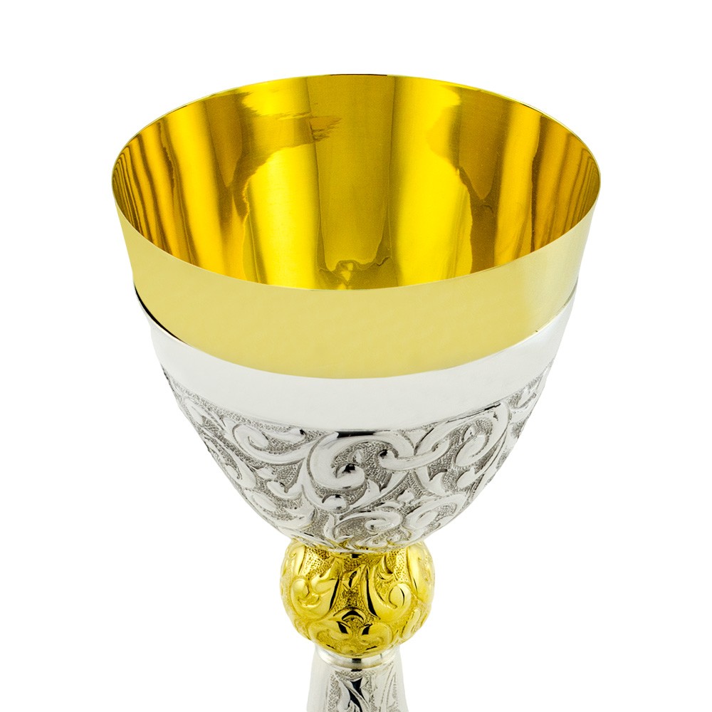 Il calice è in argento bicolore con doratura coppa interna in bagno oro 24k, lavorato completamente a mano da esperti artigiani con collaborazione di antichi maestri argentieri.