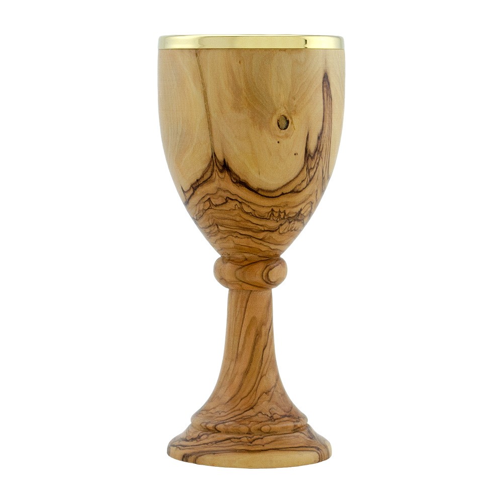 Il calice è alto 20 cm ed è realizzato in legno di ulivo con interno coppa argento 800, per proteggere il legno dalle infiltrazione del vino liturgico.