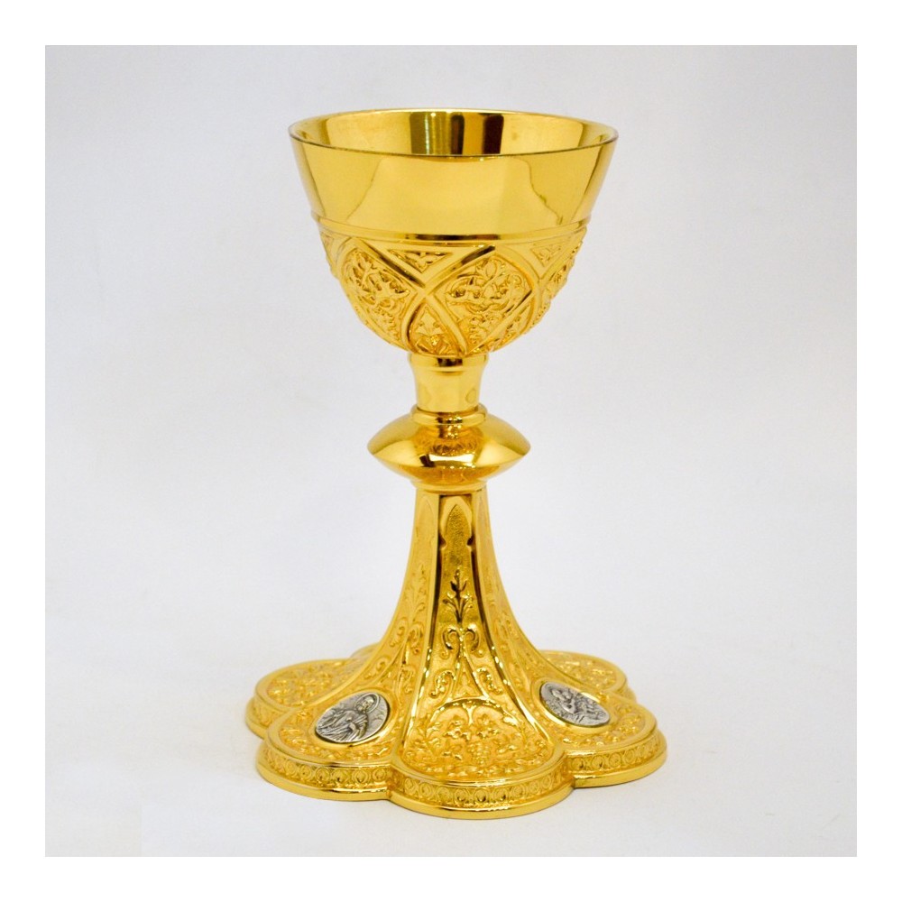 Calice liturgico con base decorata e pietre rosse.