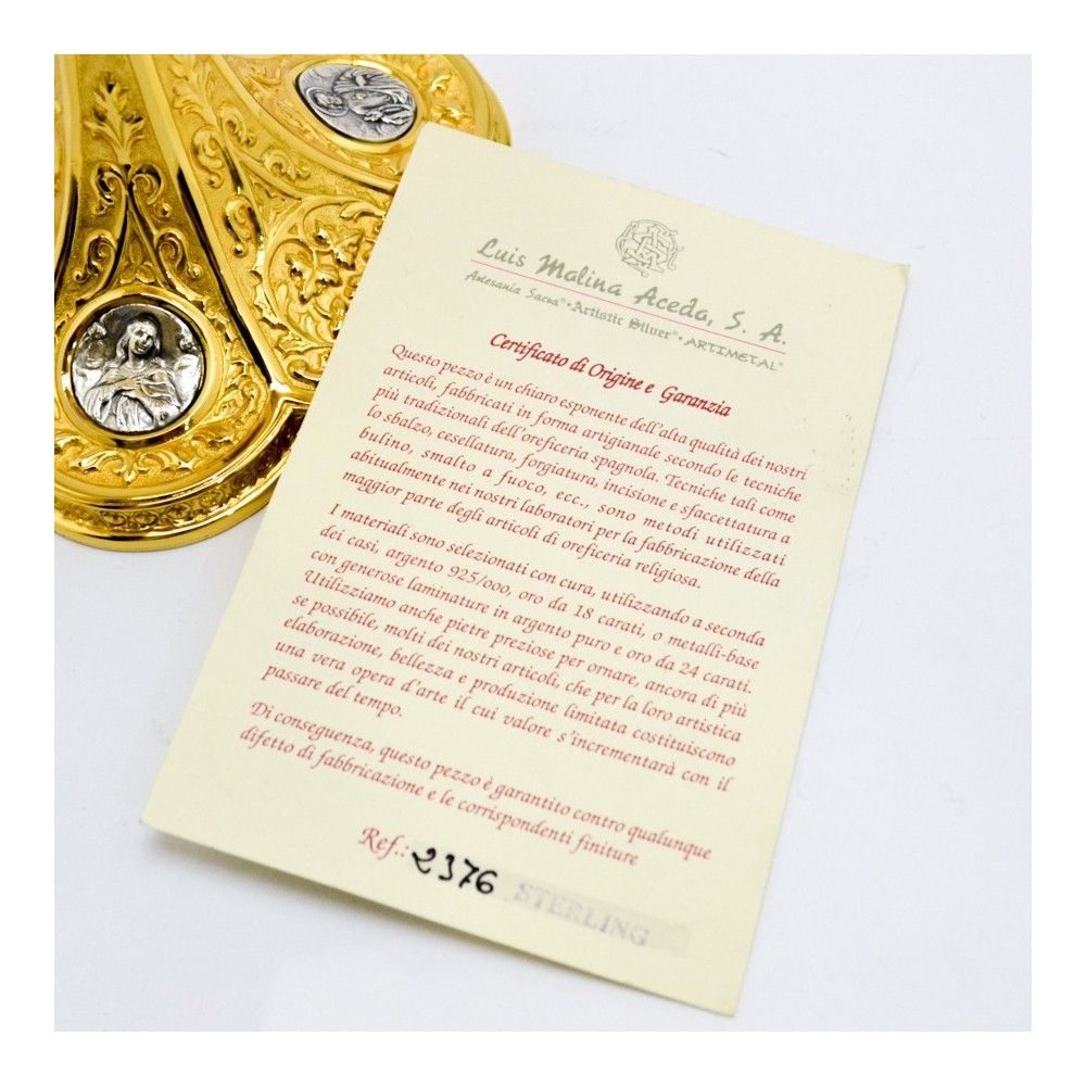 Calice in ottone dorato di manifattura spagnola con coppa in argento. Per chi lo desiderasse è possibile abbinarci anche la pisside con stessa lavorazione. In omaggio la custodia porta calice.
