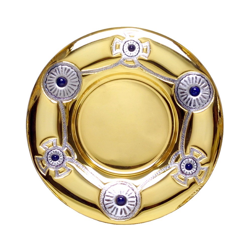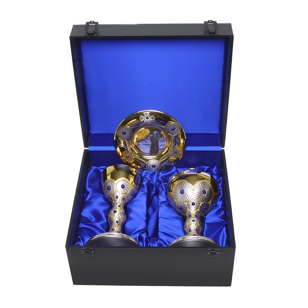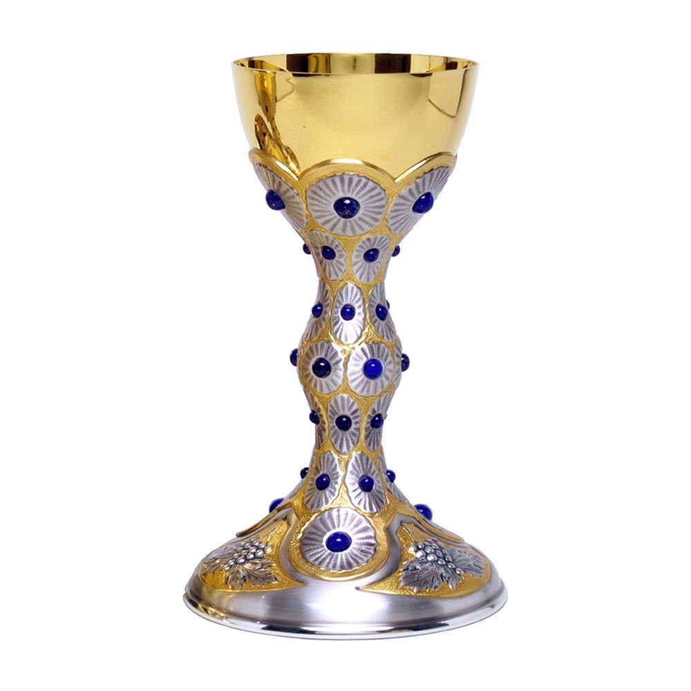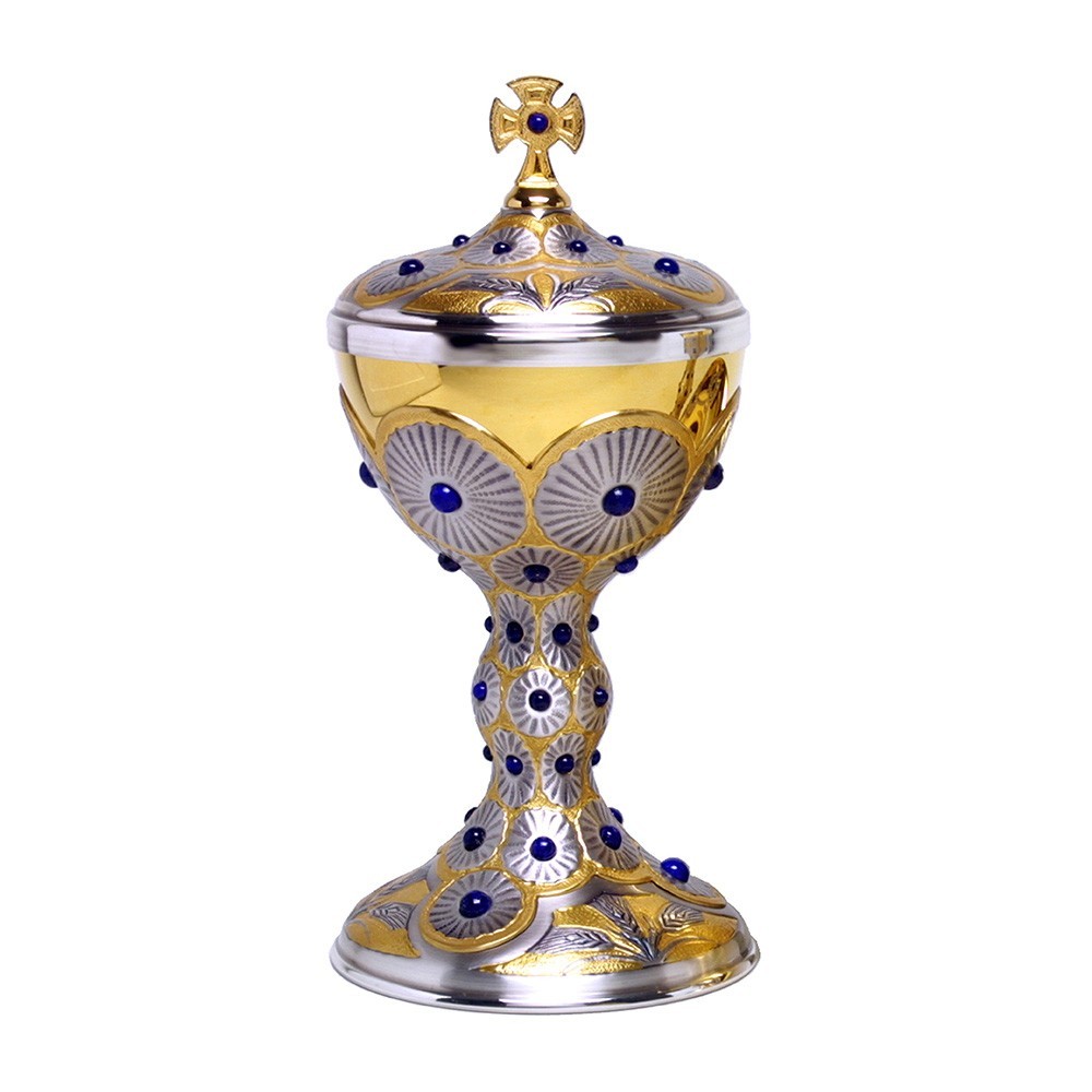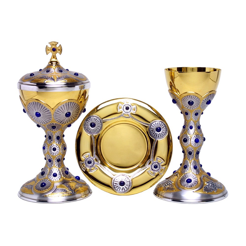 Set completo di valigetta con calice, pisside e Patena. Il calice, la pisside e la patena sono in argento 800, arricchite con pietre lapislazzuli di colore blu, poste sulla base, sul nodo, sulla coppa e sulla patena. Articolo di particolare bellezza grazie alla lavorazione curata nei minimi dettagli e al bagno d'argento.