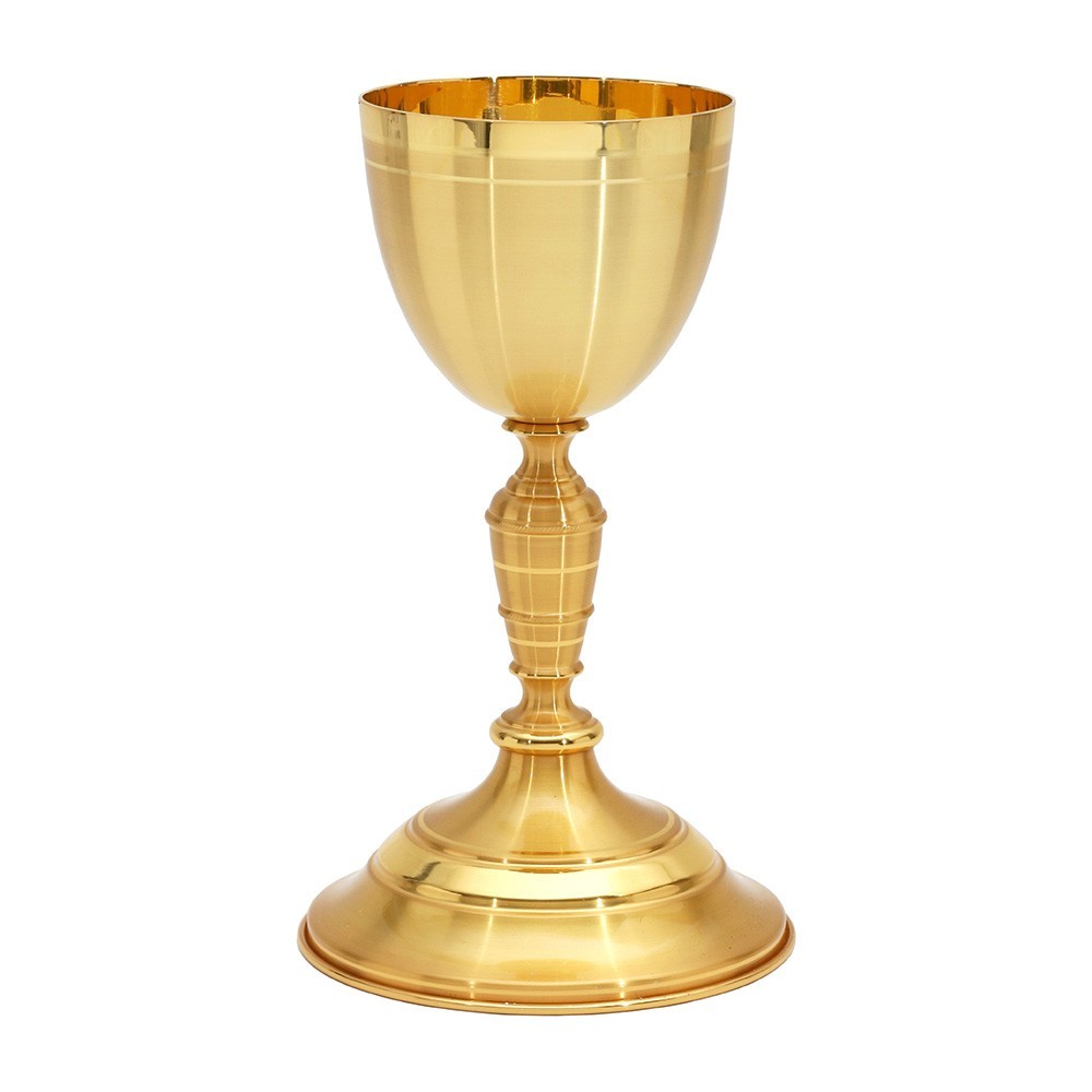 Calice da messa realizzato in ottone con finitura color oro. Questo calice liturgico è stato ideato e realizzato interamente da un'azienda italiana, con decenni di esperienza nella lavorazione in metalli degli articoli sacri.