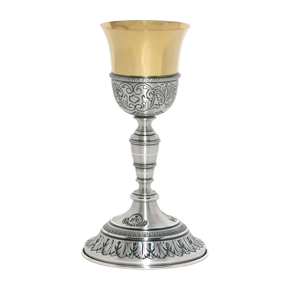 Calice da messa in ottone bicolore cesellato, raffigurante il simbolo JHS e decorazioni di foglie. Questo calice liturgico si presenta con piede a corolla interamente in ottone argentato, mentre la coppa è in ottone con finitura oro. L'altezza del calice è 20 cm e il diametro coppa misura 8 cm.