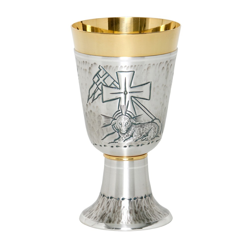 Calice in ottone cesellato con Agnello e croce. Questo calice liturgico è prodotto in ottone bicolore oro e argento. Made in Italy.