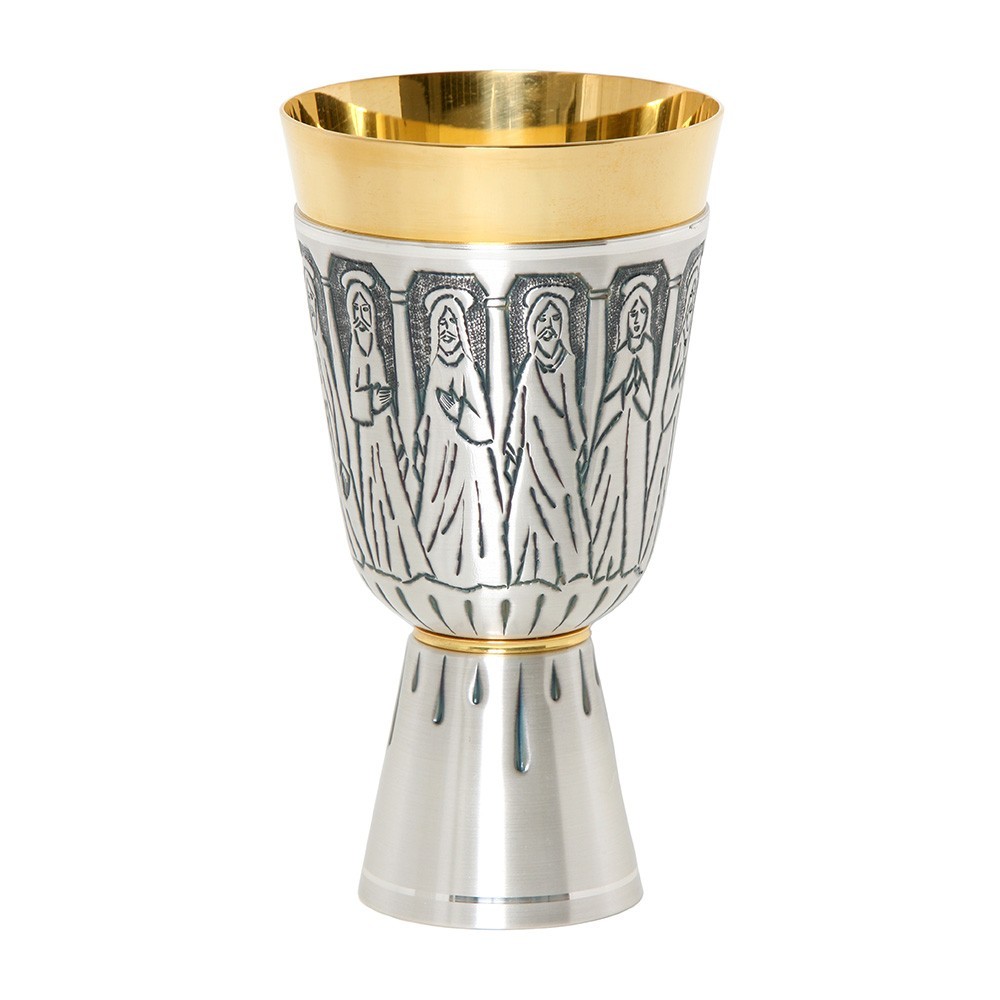 Calice liturigco in ottone con finiture oro e argento, con incisione dei Dodici Apostoli. L'interno del calice è in ottone dorato. Questi calici sono protetti esternamente da una vernice trasparente Vitrex cotta a forno per proteggerli dall'impronte, polvere e umidità.