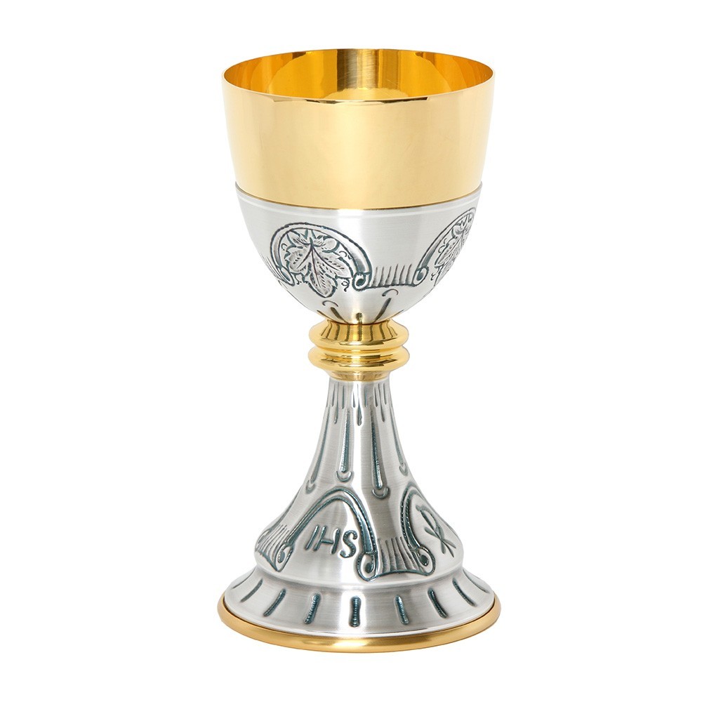 Questo calice liturgico è finemente cesellato raffigurante il simbolo JHS e con foglie d'uva. L'interno del calice è in ottone dorato e l'esterno è ricoperto da una vernice trasparente Vitrex cotta a forno che permettere di prottegere il prodotto dalle impronte delle dita, polvere e umidità. Made in Italy.