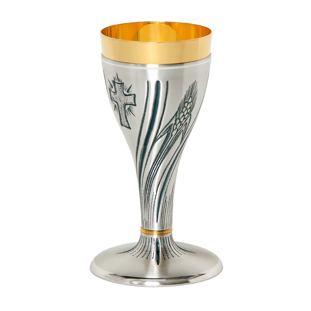 Calice da messa per la celebrazione eucaristica. Il calice si presenta con decori incisi raffiguranti spighe di grano e croce. Realizzato interamente in ottone bicolore con finiture oro e argento. L'interno del calice è in ottone dorato. Made in Italy.