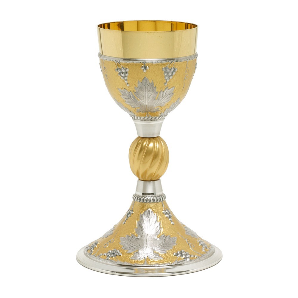 Calice da messa in ottone finemente decorato in rilievo "Uva e Foglie di Vite".