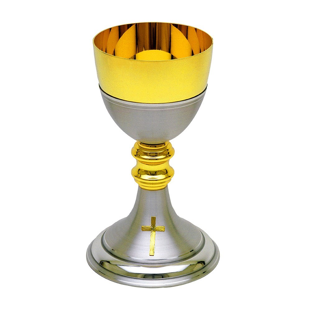 Calice liturgico in ottone con finiture oro e argento, con incisione Croce. L'interno del calice è in ottone dorato. Questi calici sono protetti esternamente da una vernice trasparente Vitrex cotta a forno per proteggerli dalle impronte delle dita, polvere e umidità.