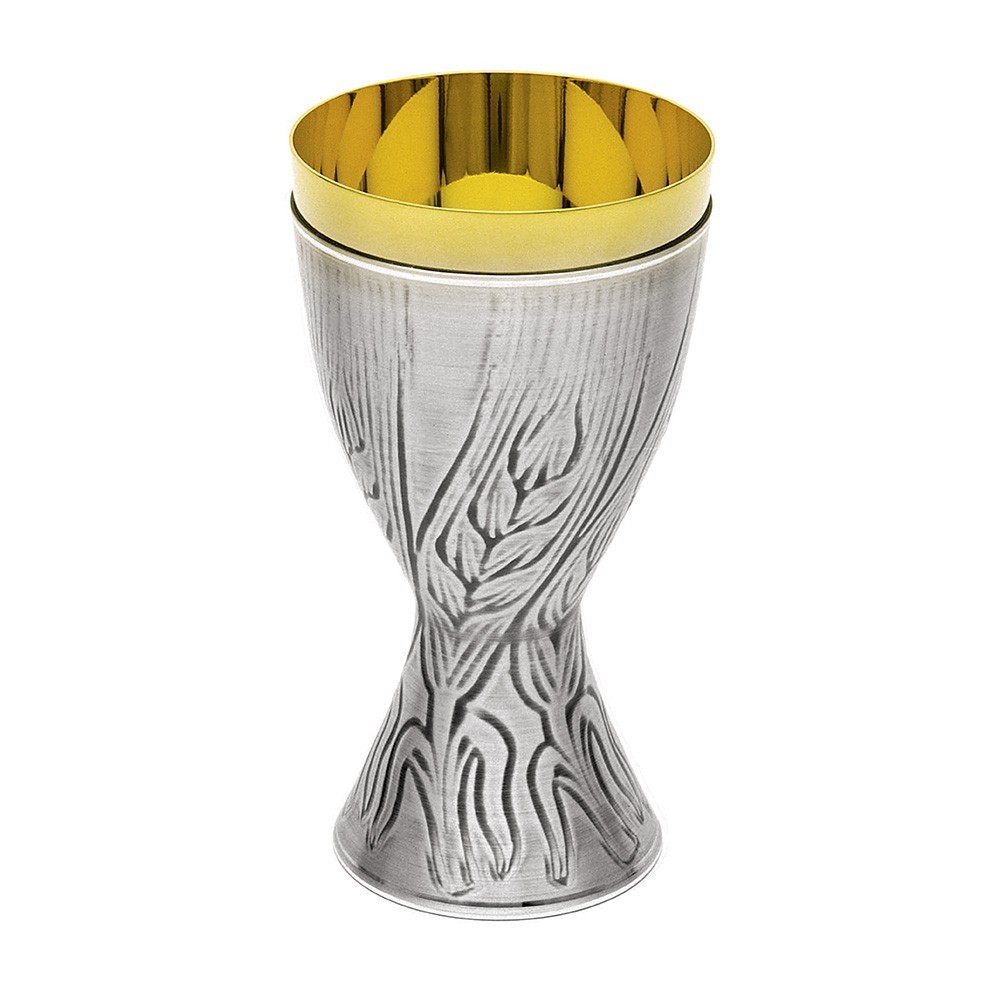 Calice da messa realizzato con base in ottone argento e coppa dorata. La base è finemente lavorata con spighe di grano. Tutti i nostri articoli, come pure i calici esternamente vi è una vernice trasparente Vitrex cotta a forno per proteggerli dalle impronte, polvere e umidità.