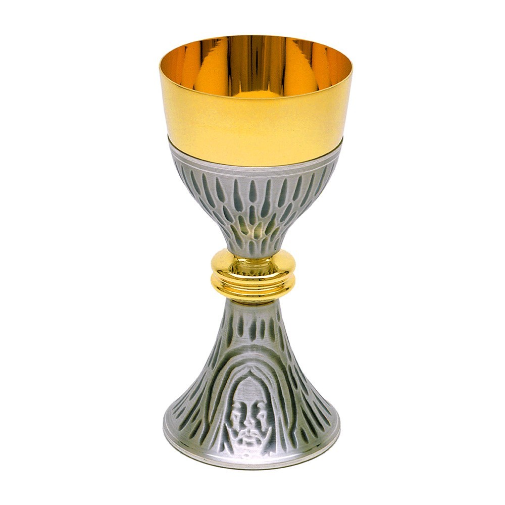 Calice messa realizzato in ottone con finiture bicolore oro e argento. Il calice è finemente decorato e sulla base vi è rappresentato il Santo Volto di Gesù. L'interno del calice è in ottone dorato.