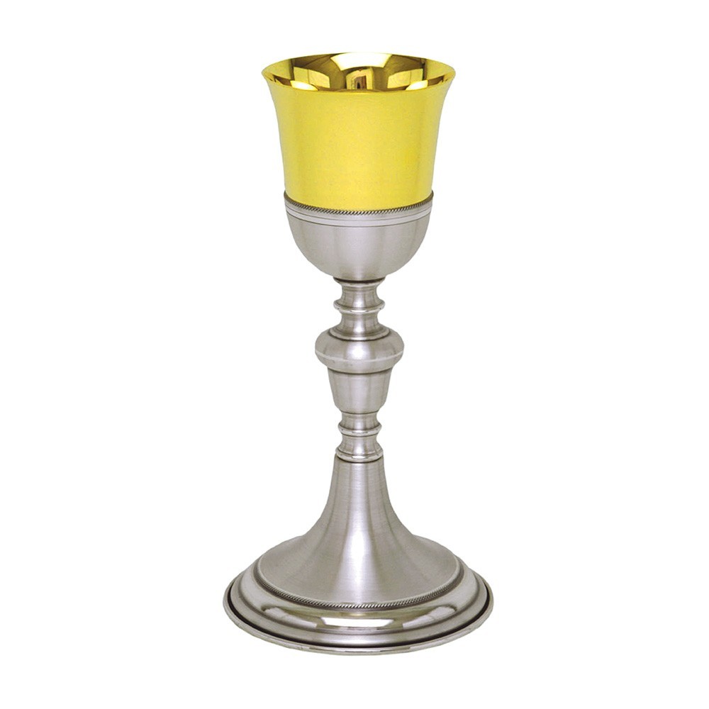 Calice liturgico in metallo bicolore. L'interno del calice è in ottone dorato. Su questi arredi sacri vi è stata applicata esternamente una vernice trasparente Vitrex cotta a forno per proteggerli dalle impronte delle dita, polvere e umidità.