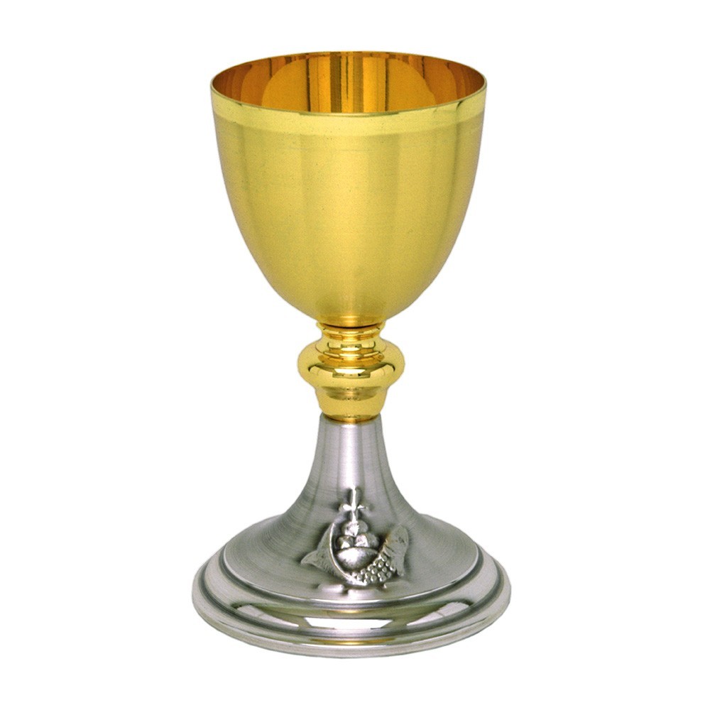 Calice liturgico con coppa in ottone dorato e base argento. Sulla base sono decorati i simboli "Pani e Psci". L'interno del calice è in ottone dorato, esternamente è stata applicata una vernice trasparente cotta a forno per proteggerli dalle impronte delle dita, polvere e umidità.Articolo di ottima qualità, prodotto interamente da un'azienda italiana.