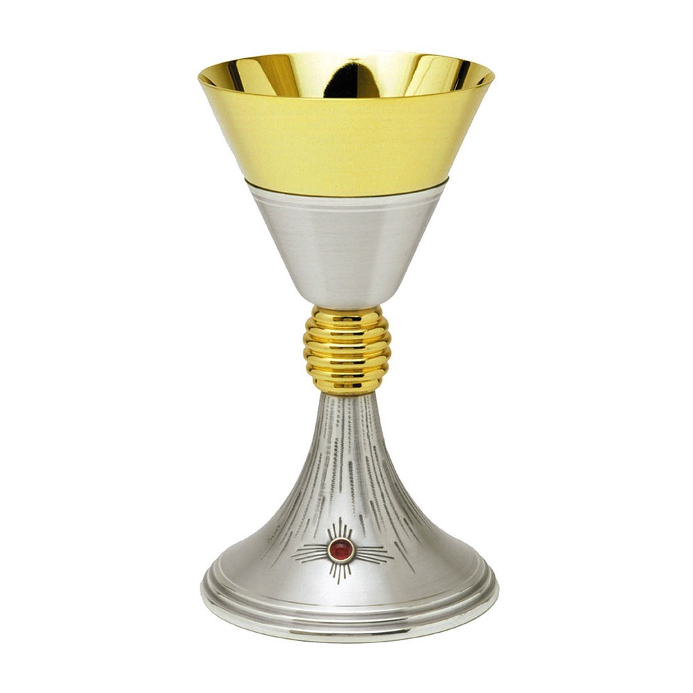Calice da messa in ottone bicolore, completo di nodo croce e arricchito con una piccola pietra rossa. L'interno del calice è in ottone dorato, esternamente vi è applicata una vernice trasparente Vitrex cotta a forno per protteggere l'articolo dalle impronte delle dita e dalla polvere.
