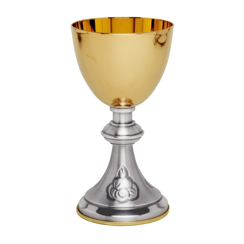 Calice liturgico in ottone con finiture oro e argento. La coppa è in ottone dorato, mentre la base è ottone argento. L'altezza del calice è 15,5 cm e il diametro coppa è 8 cm. Produzione 100% italiana.