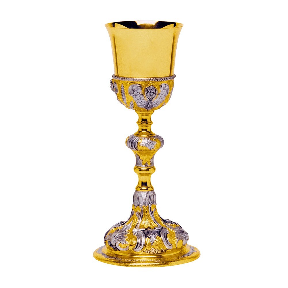 Calice da messa in ottone finemente decorato. Realizzato i in ottone con finiture oro e argento, con decori foglie e angeli. L'interno del calice è in ottone dorato, mentre l'esterno vi è applicata una vernice trasparente Vitrex cotta a forno per proteggere dalle mpronte delle dita, polvere e umidità.