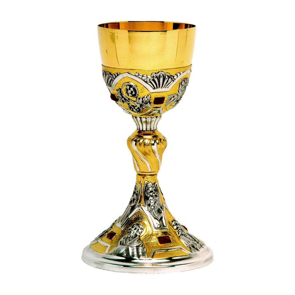Calice da messa in stile barocco, raffigurante i quattro Evangelisti. Il calice è in ottone bicolore con coppa in argento 880/1000, arricchito con delle graziose pietre rossa. Non contiene nikel. Articolo di ottima fattura e di particolare bellezza grazie alla lavorazione eseguita da esperti artigiani italiani.