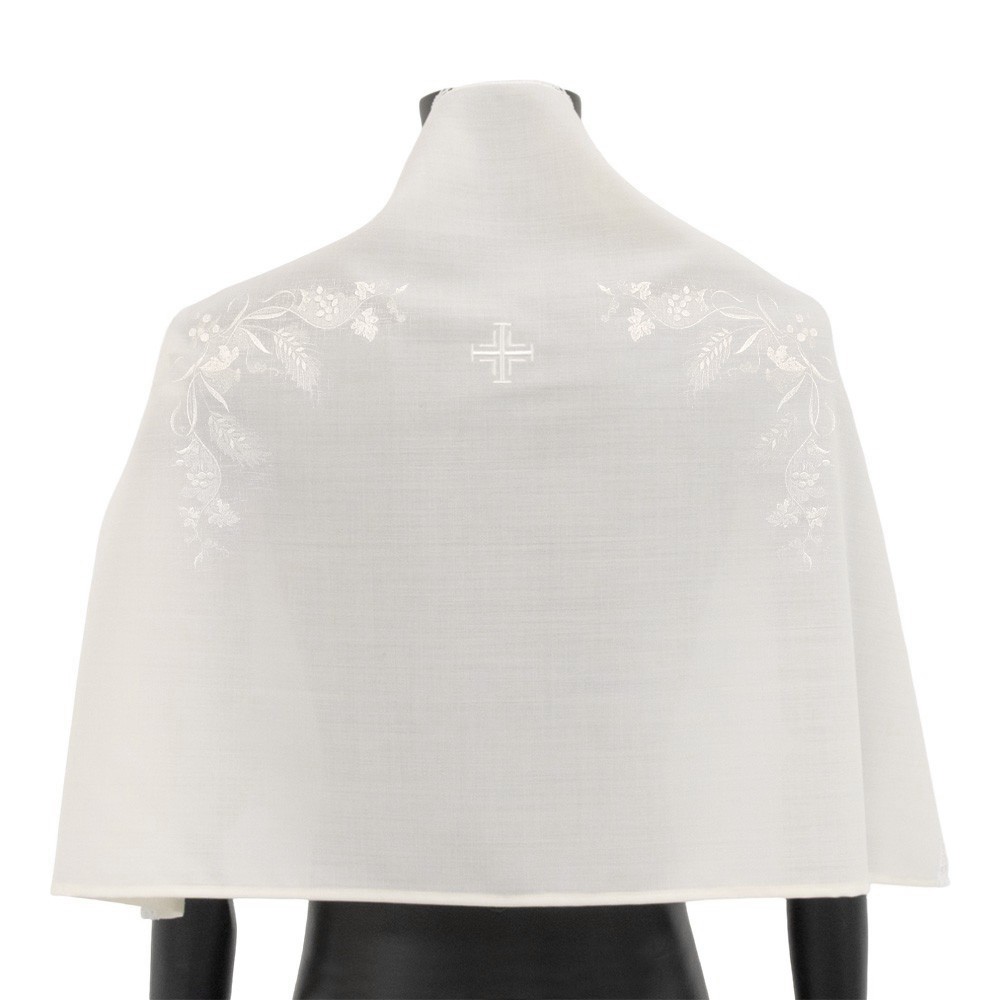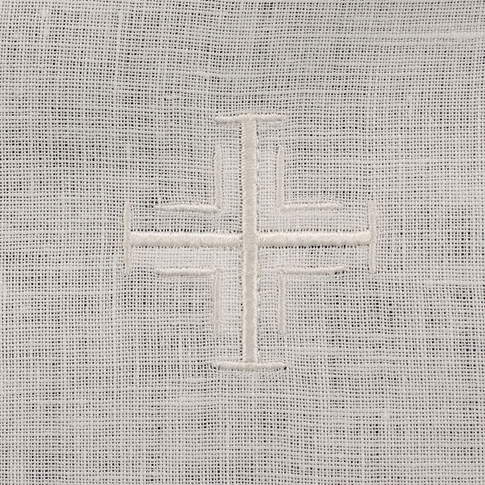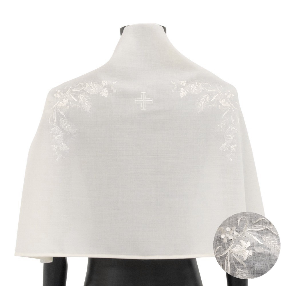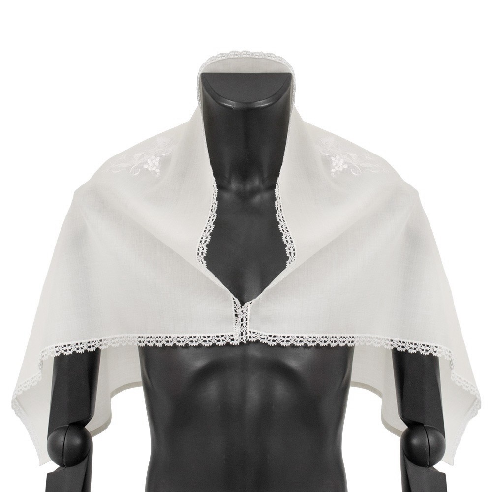 Amitto sacerdotale confezionato in tessuto 100% lino, arricchito con pizzo e ricamo eseguito finemente a macchina.