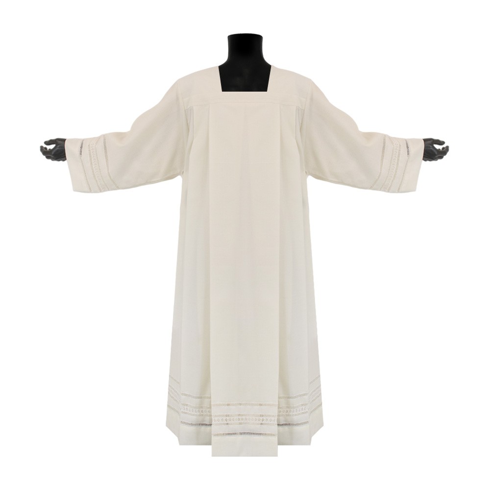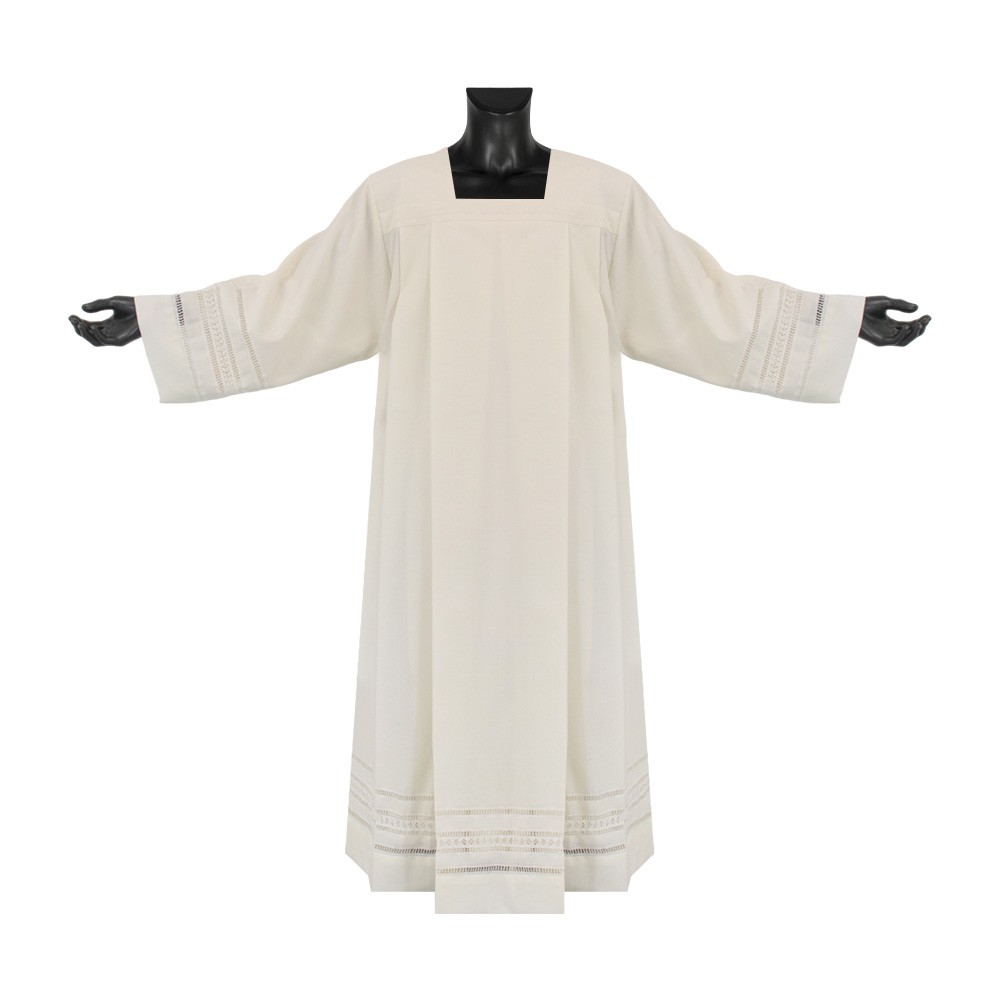 Camice per sacerdote realizzato in fresco lana e poliestere, rendendo il capo traspirante e leggero, mentre la percentuale di poliestere fa si che sia facile sia nel lavaggio che nella stiratura.