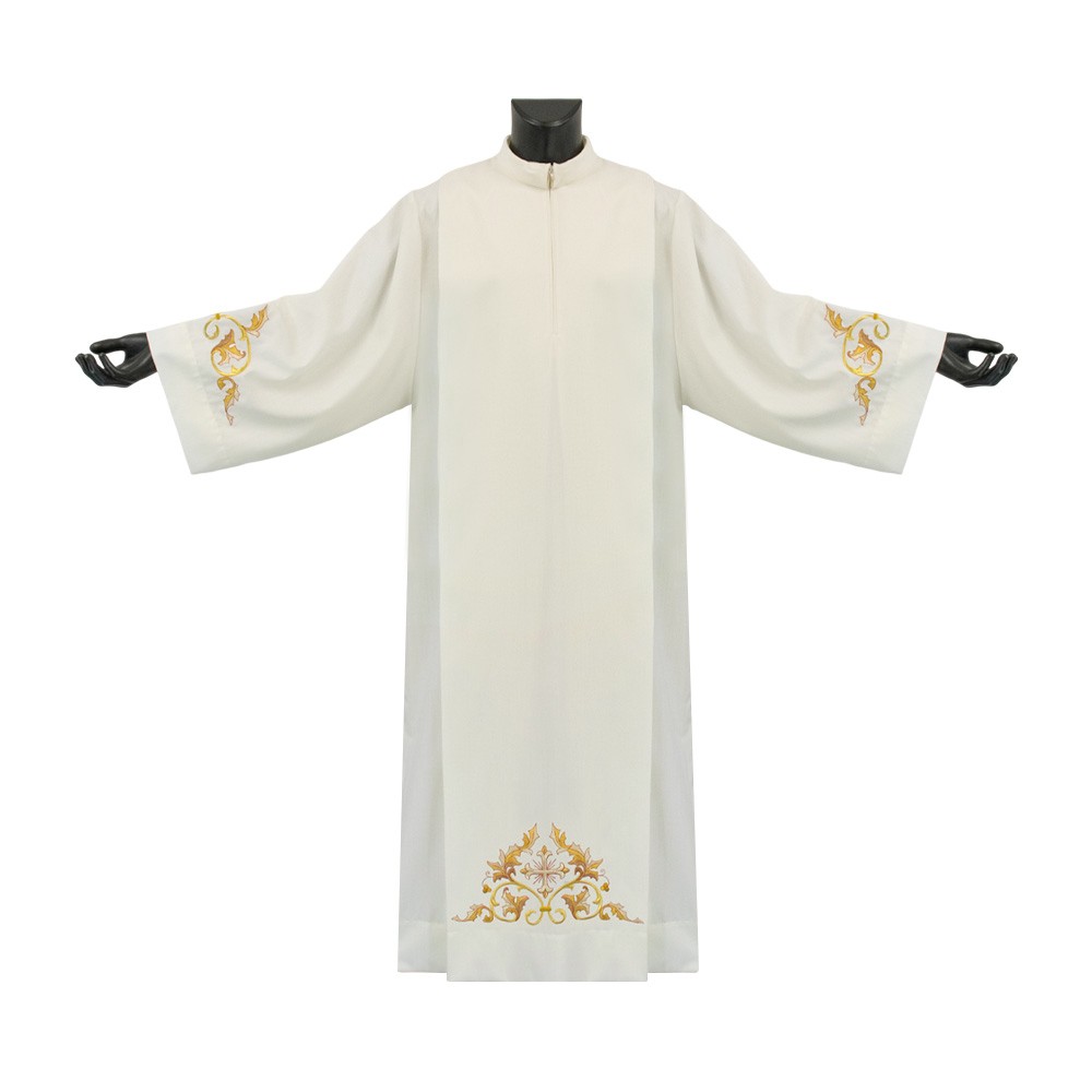 Elegante camice sacerdotale di colore avorio, disponibile taglia 145, caratterizzato da pieghe e pratica zip sul fronte. Questo camice è particolarmente apprezzato per l'ottima vestibilità e per i ricami realizzati con precisione a macchina, posti attorno alle maniche e nella parte inferiore.