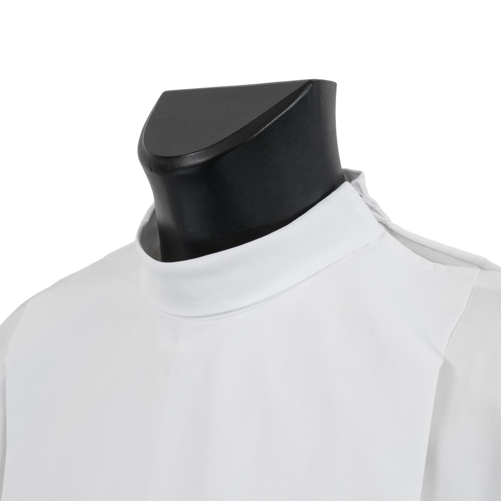 Camice liturgico bianco di ottima qualità, progettato per sacerdoti e concelebranti. Questo camice è disponibile nella taglia 145 cm ed è realizzato per offrire comfort e praticità grazie alla zip e apertura laterale. Si presenta con eleganti tramezzi posti in fondo al camice e sulle maniche, per un tocco di stile unico.
