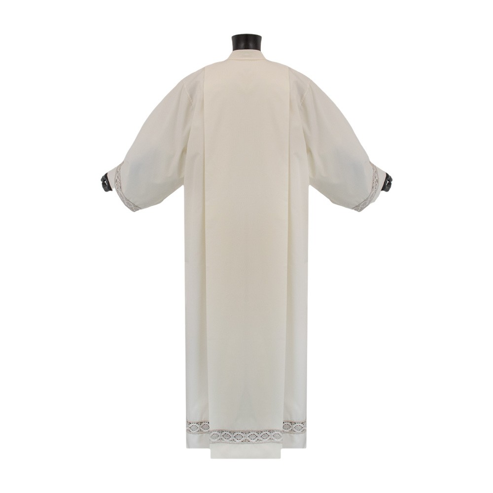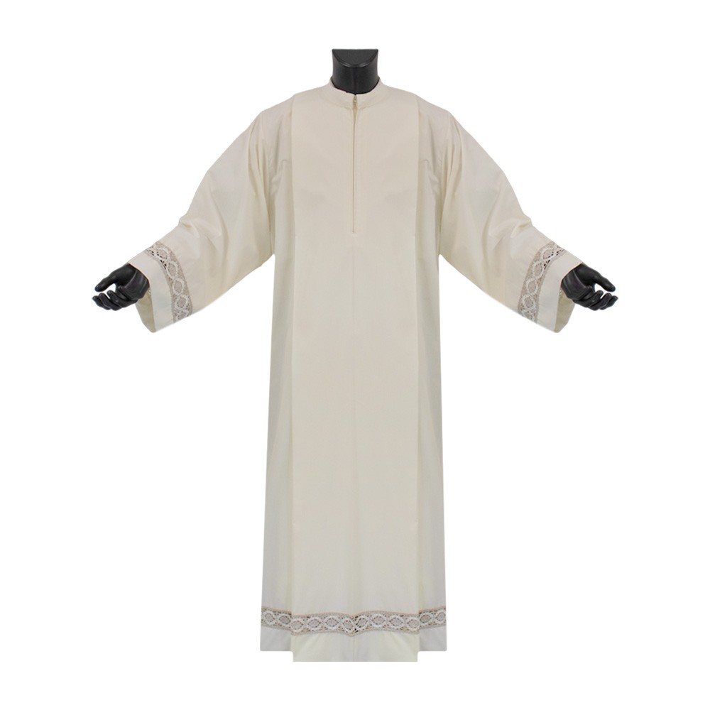 Questa veste sacra è realizzata in tessuto cotone e poliestere, molto particolare e delicato è il ricamo intrecciato di colore avorio e nocciola, presente sia sulla parte bassa del camice che su entrambe le maniche. Ottima la vestibilità.