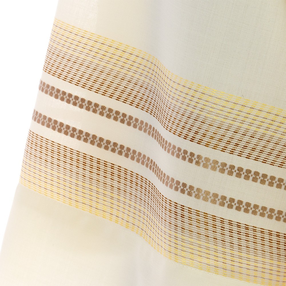 Camice Sacerdotale color avorio realizzato in misto lana, con ricamo a righe color oro e marrone attorno alle maniche ed intorno a tutta la parte bassa. Particolare: apertura a con zip.