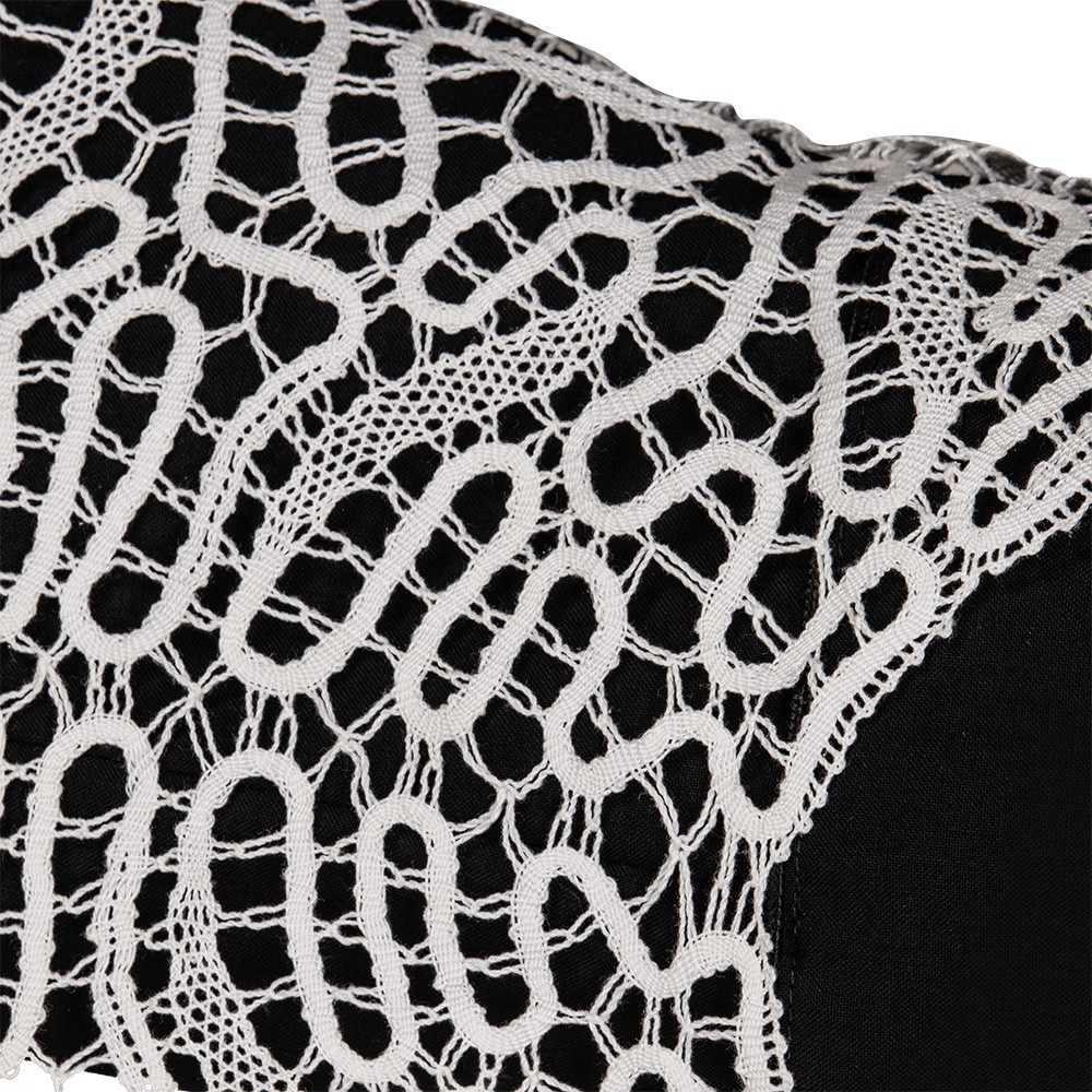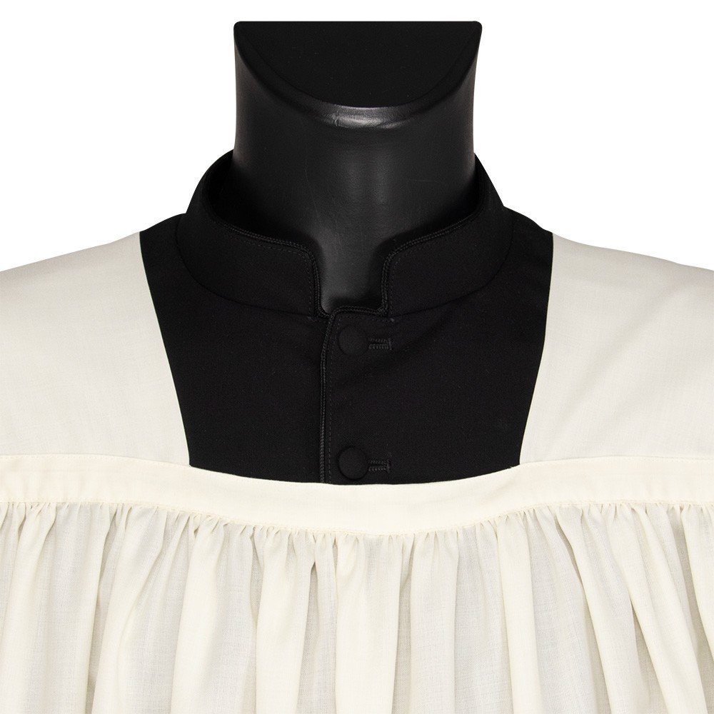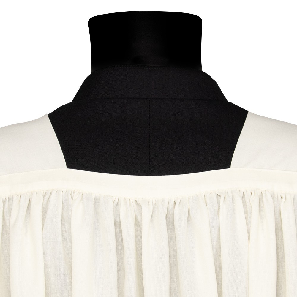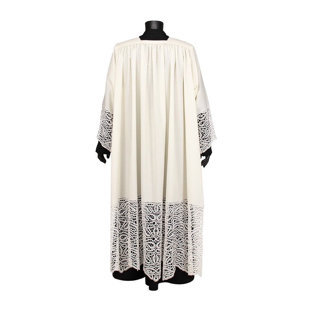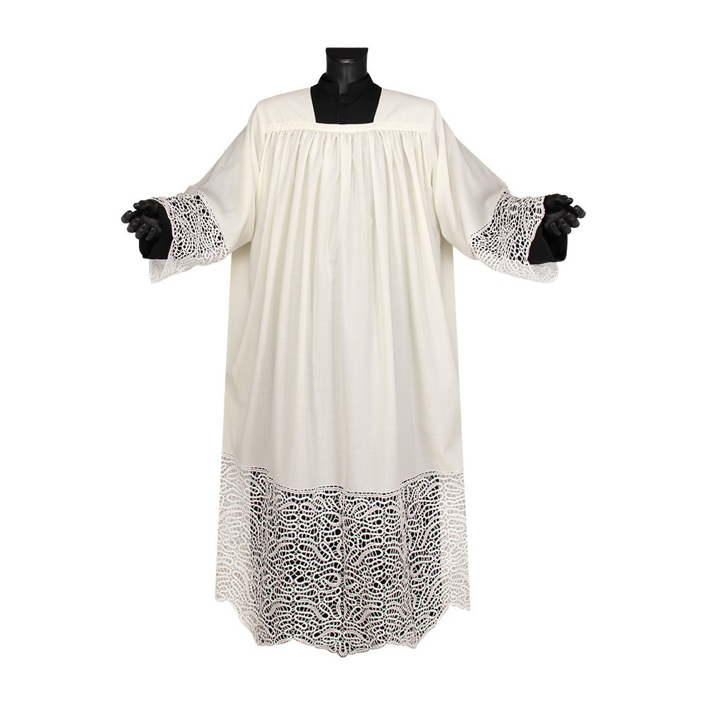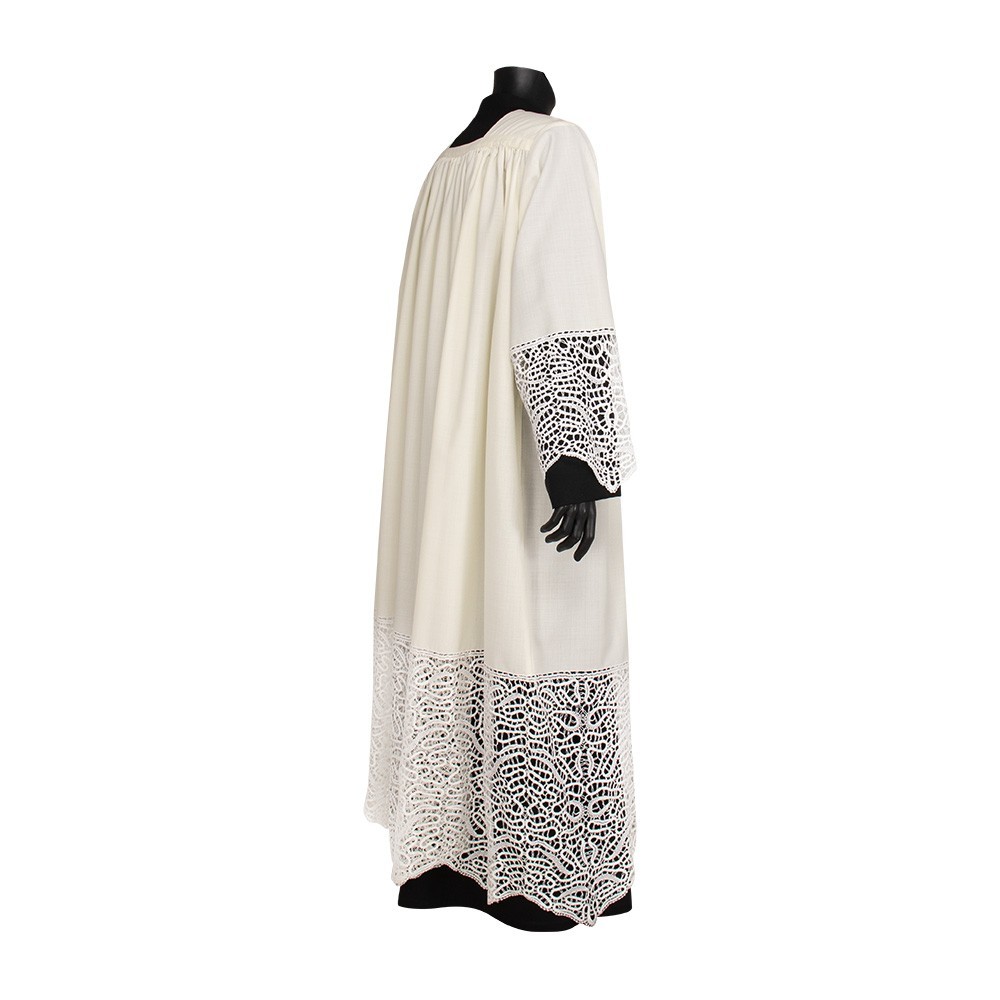 Camice in misto lana (45% lana e 55% poliestere) con collo quadro. Questo paramento sacro molto particolare si presenta con un grazioso pizzo entrodure inserito sia in fondo al camice (alto 50 cm) che su entrambe le maniche (alto 27 cm ca).