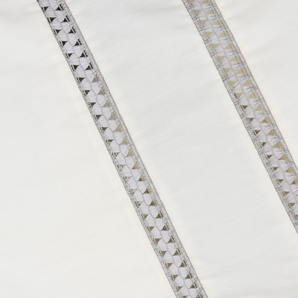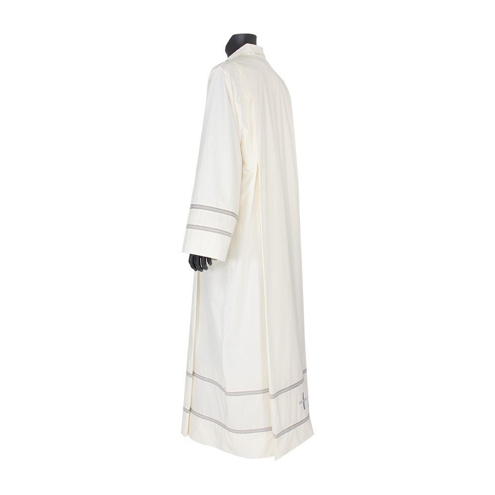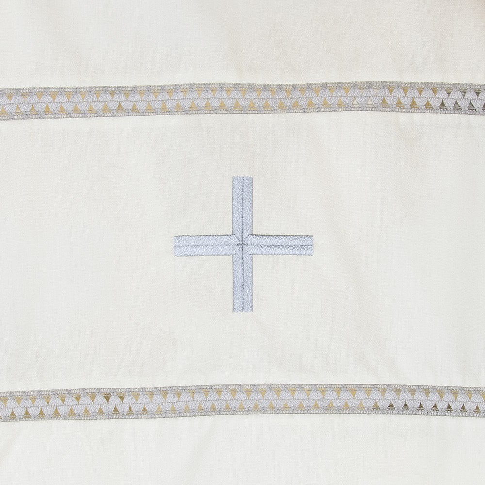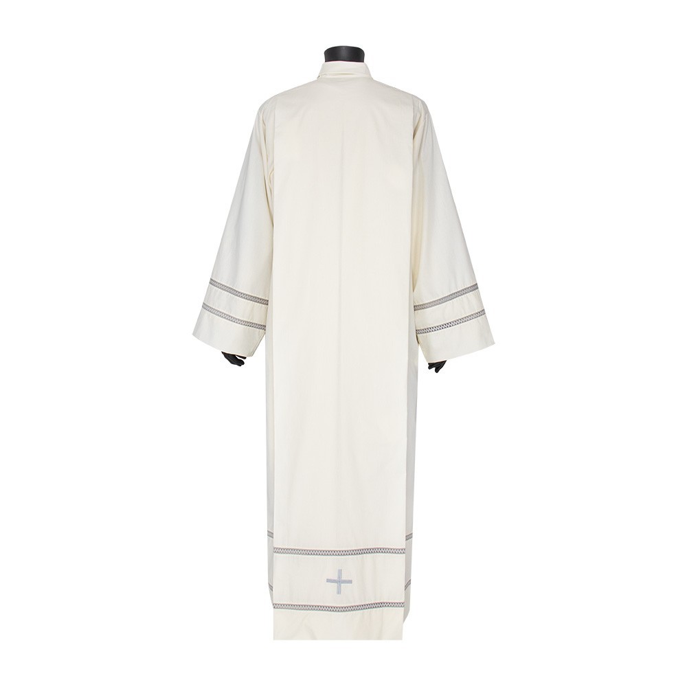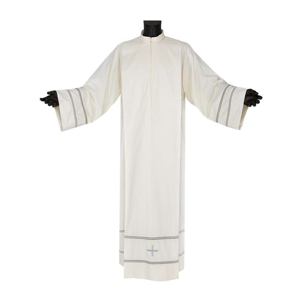Camice color avorio con gigliuccio ricamato a macchina. Il ricamo è realizzato color grigio presente in fondo al camice e due giri attorno alle maniche. E' realizzato in tessuto misto cotone (50% Cotone / 50% Poliestere).