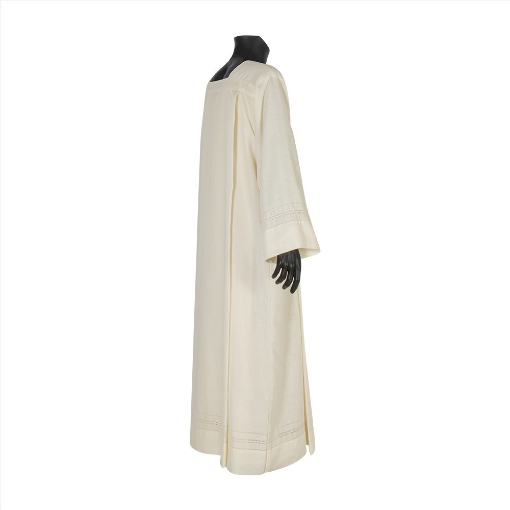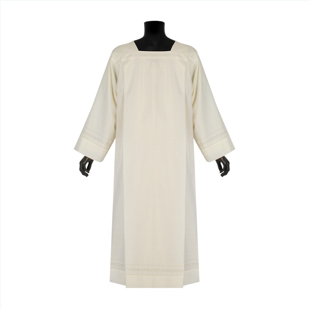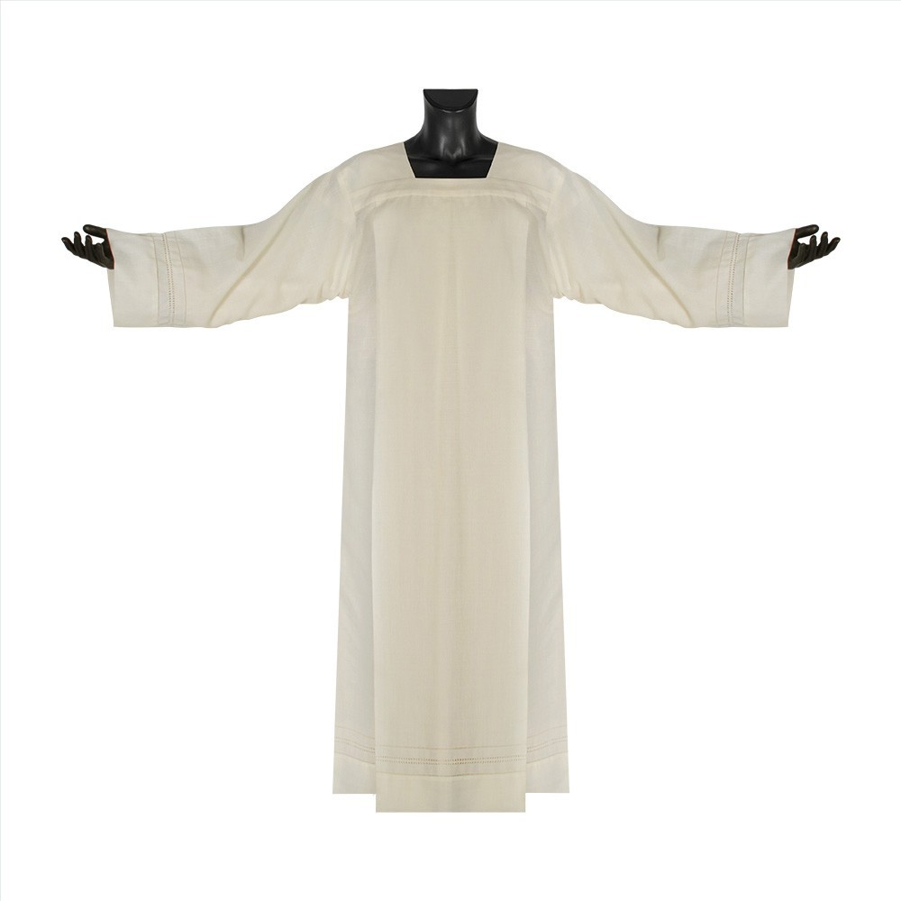 Camice liturgico color avorio, realizzato con collo quadro e piegoni. Tessuto misto: 40% lino e 60% poliestere. . Particolare e delicato è il ricamo che gira attorno alle maniche e alla circonferenza in basso.