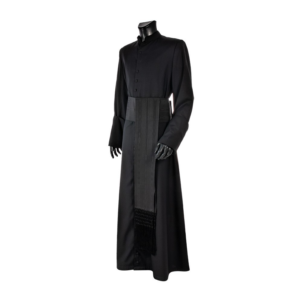Fascia nera per talare realizzata in pregiato tessuto misto seta marezzato. La fascia è completa di frangia. Questo accessorio liturgico viene indossato al giro vita, completo di velcro cucito all'interno della fascia per poter regolarlo in più posizioni . La fascia è larga 15 cm. Articolo di ottima qualità, 100% italiano.