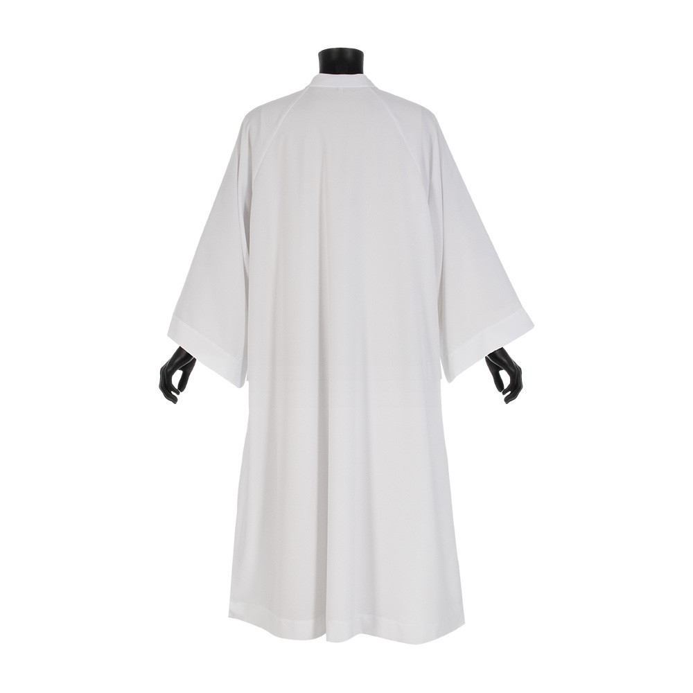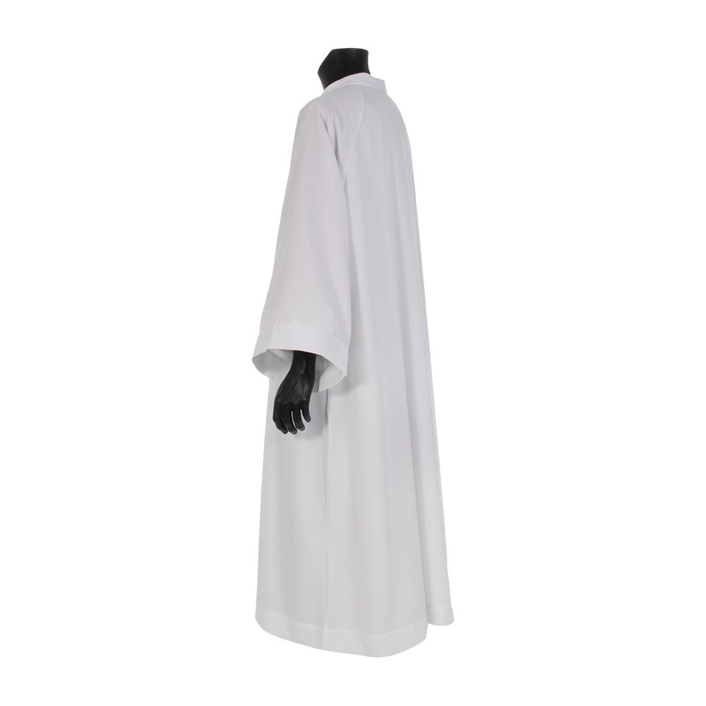 Camice per sacerdote colore bianco modello Andrea confezionato in tessuto poliestere leggero.