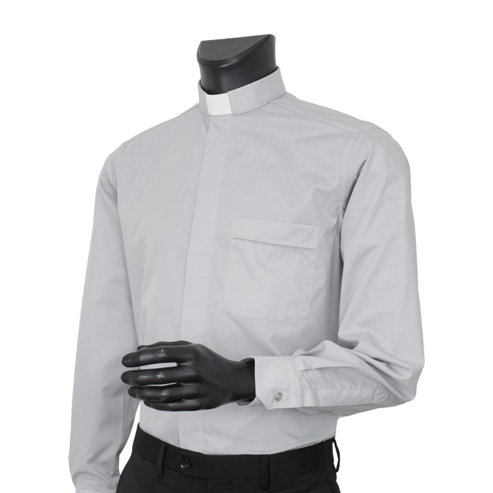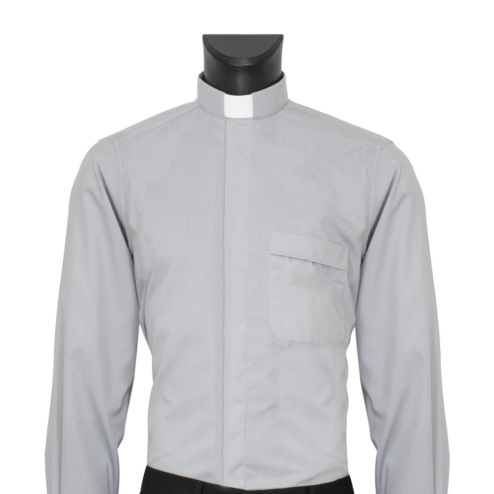 Queste camicie per sacerdoti e diaconi sono a manica lunga, con doppio bottone sui polsi, taschino singolo sul lato sinistro, 7 bottoni nascosti sul fronte e colletto bianco.